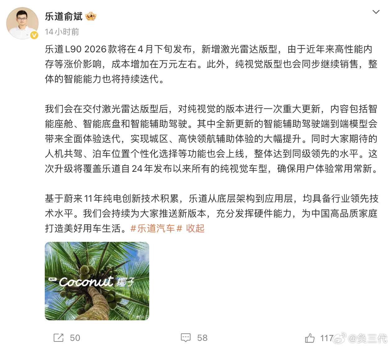 乐道汽车新款乐道L90会在4月下旬发布,有激光雷达的版本也有纯视觉的版本。目前蔚来有两颗智驾芯片:1000TOPS的神玑NX9031和700TOPS的第二颗芯片。为了大家的体验,斌哥咬咬牙就用1000TOPS的神玑NX9031吧,一步到位