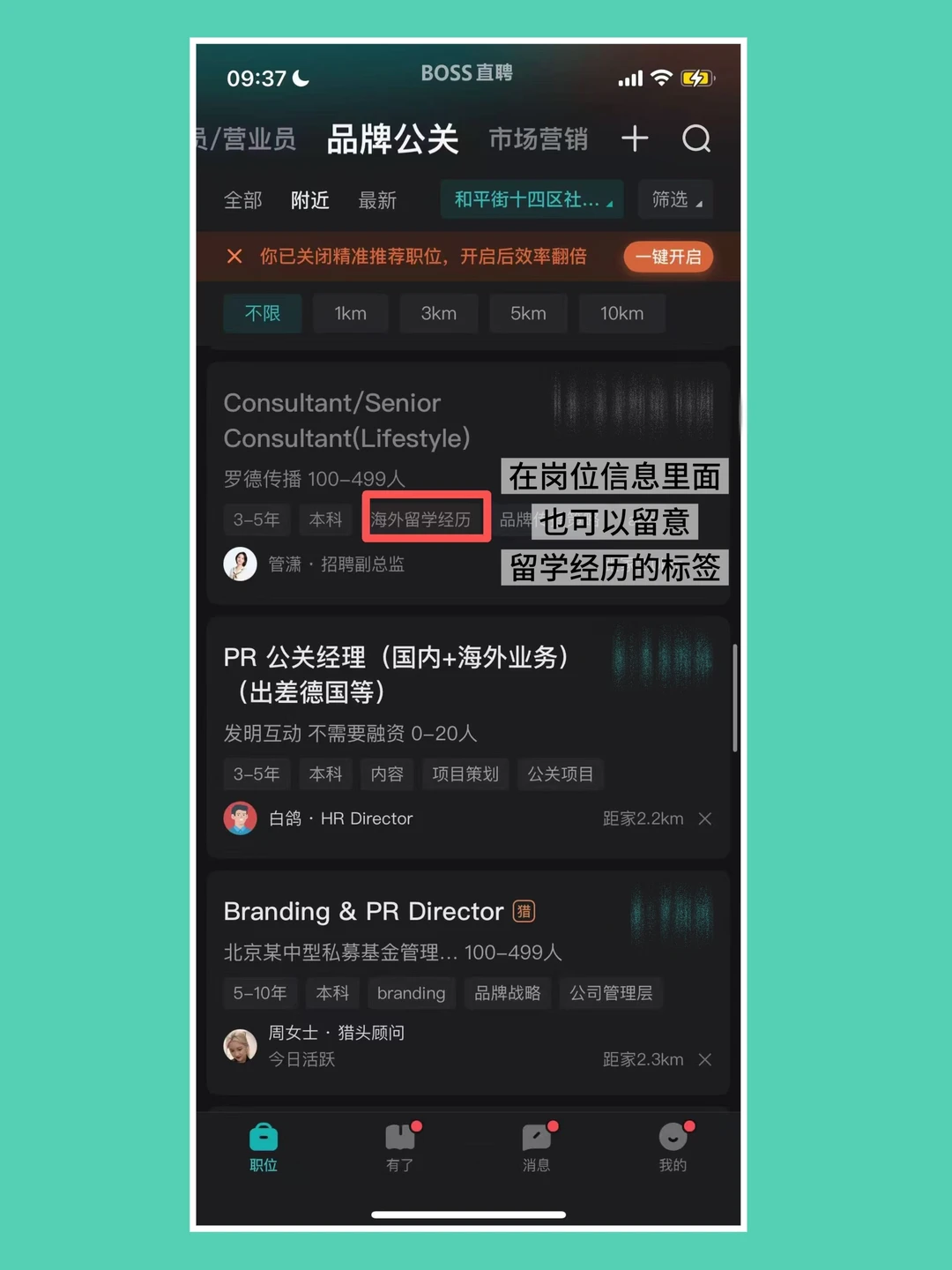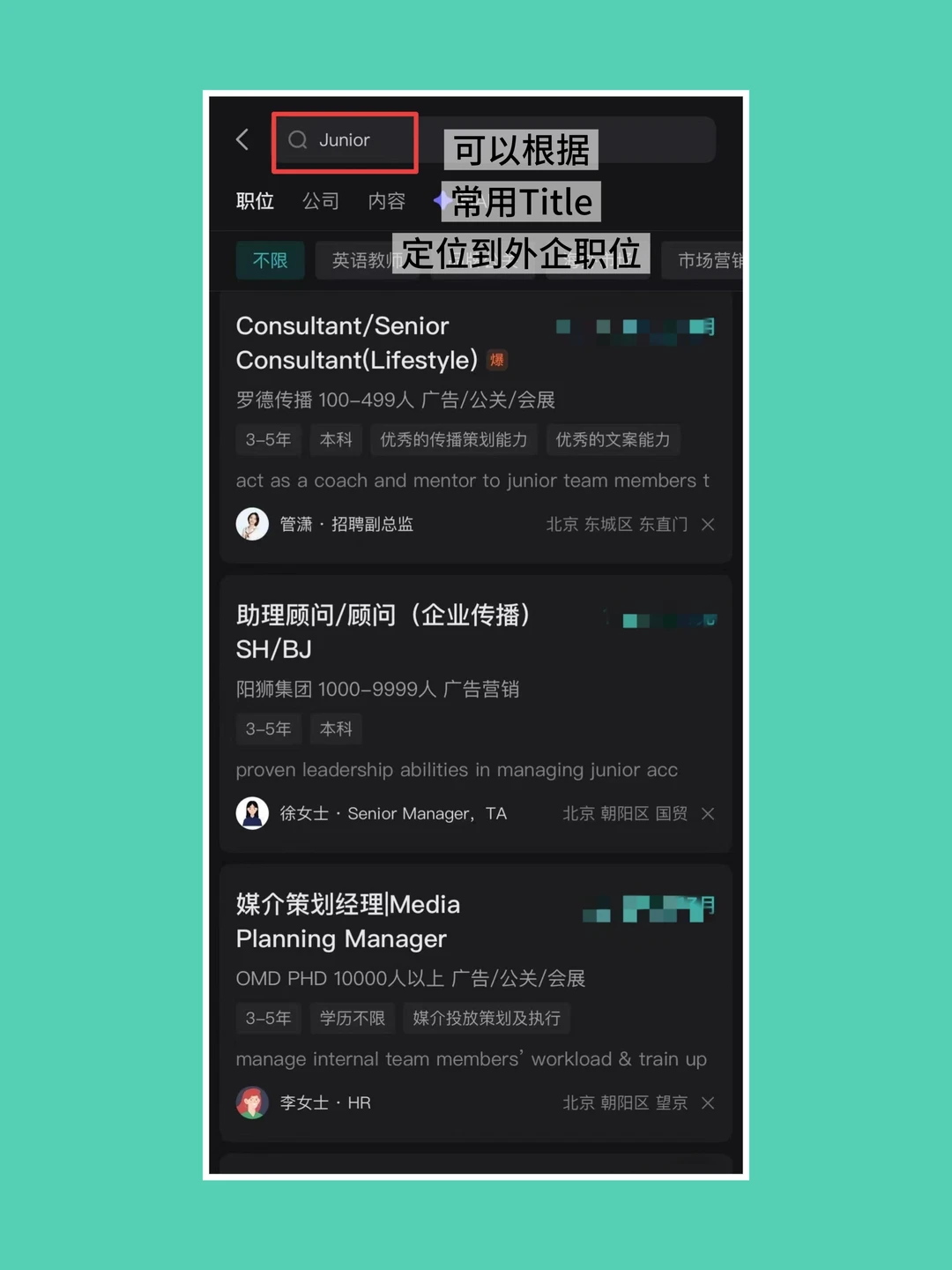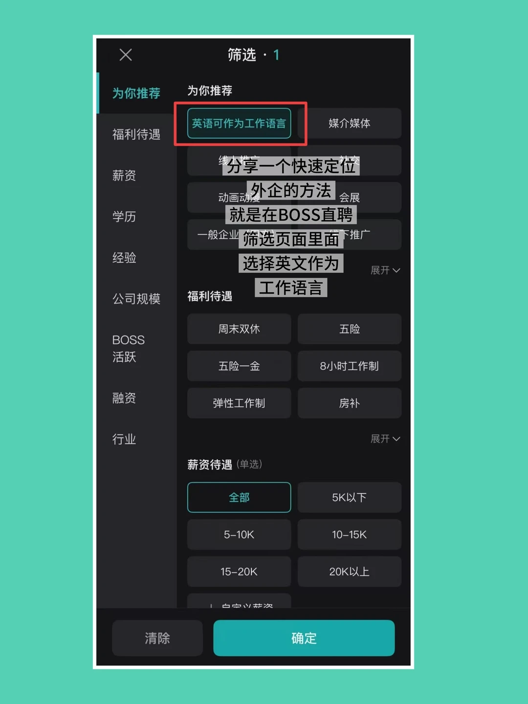 🌱最近赶着春招季,是一年一度进入外企的难得机会,想要找到合适的机会,我会用到BOSS直聘,里面的筛选功能很给力,可以挑到许多不错的职位,我会用到里面的筛选功能,将英文作为工作语言,同时可以搜索Junior, Specialist 类似的外企专用词汇,可以更加精准定位到跨国企业,在招聘岗位也可以识别海外留学经历优先的tag, 这些小技巧可以在找外企岗位的路上节省许多时间~
