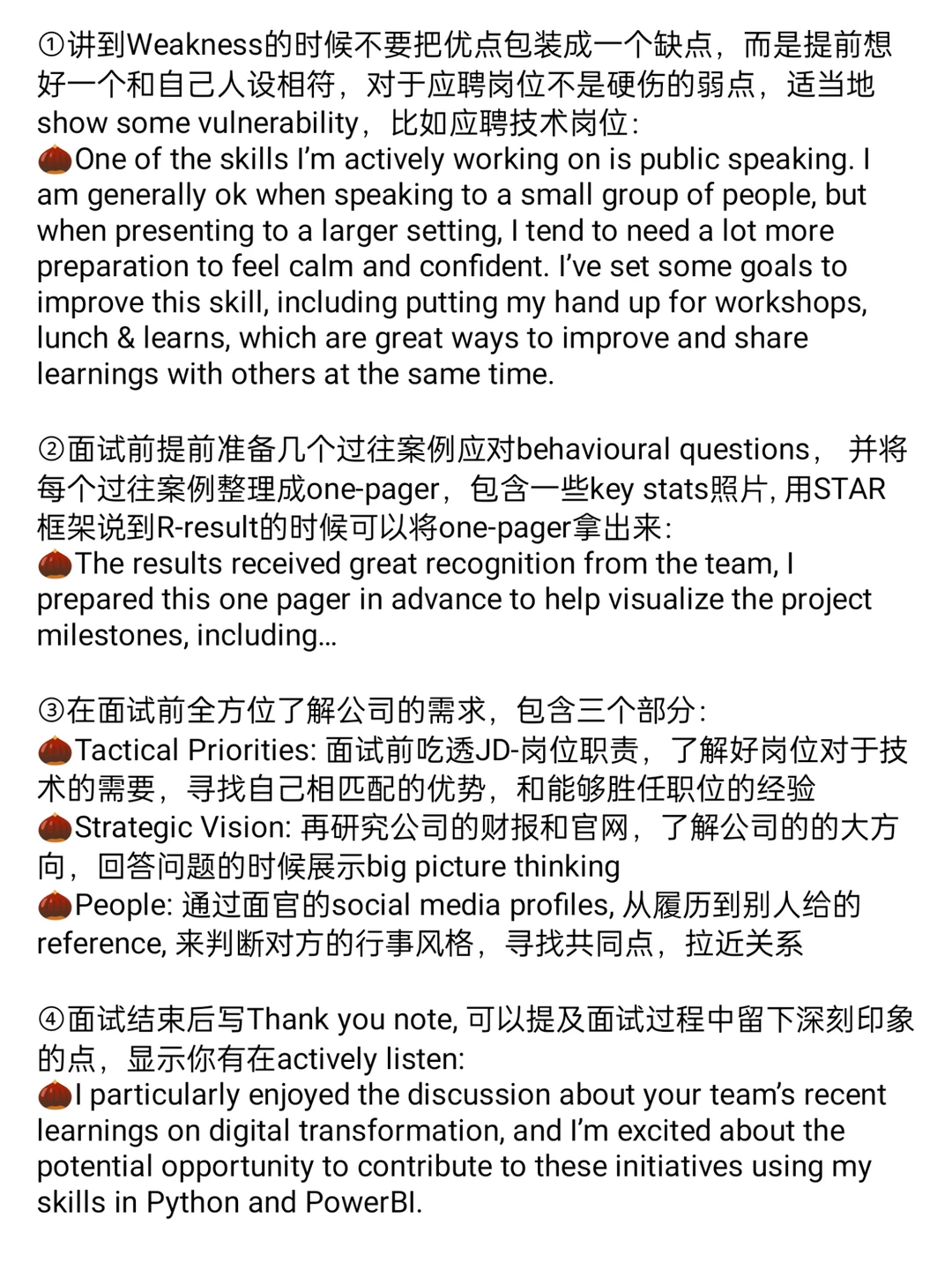 ②面试前提前准备几个过往案例应对behavioural questions, 并将每个过往案例整理成one-pager,包含一些key stats照片, 用STAR 框架说到R-result的时候可以将one-pager拿出来: