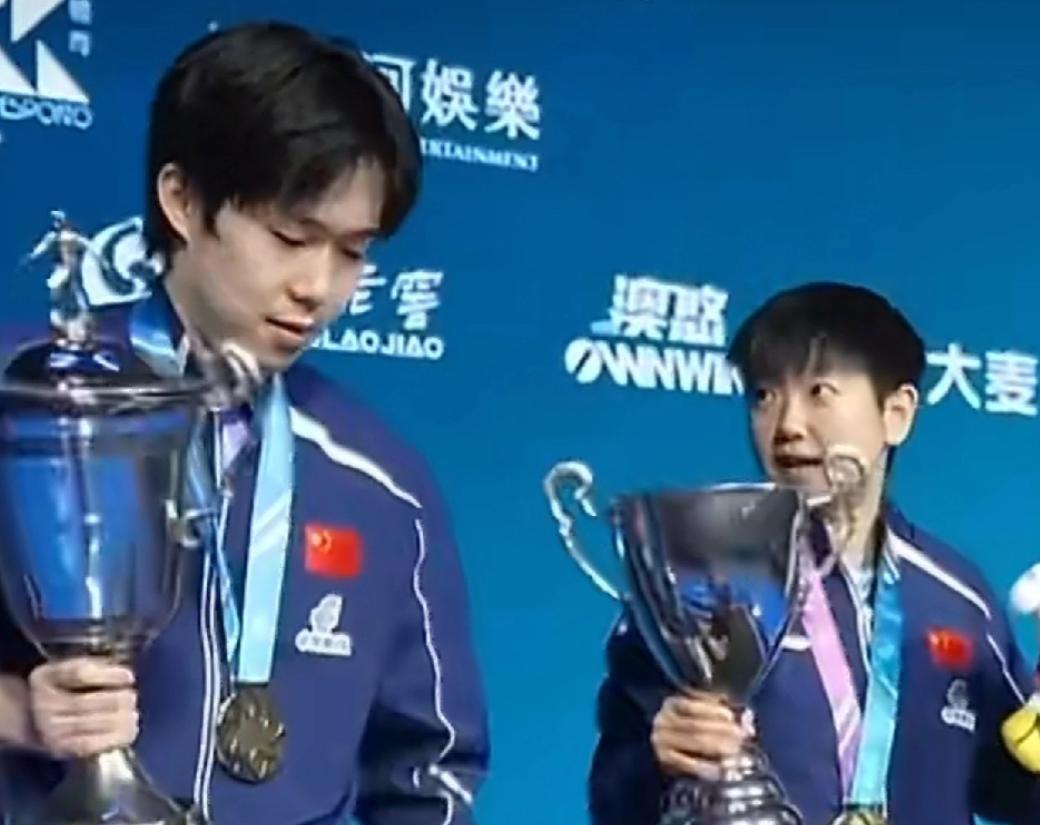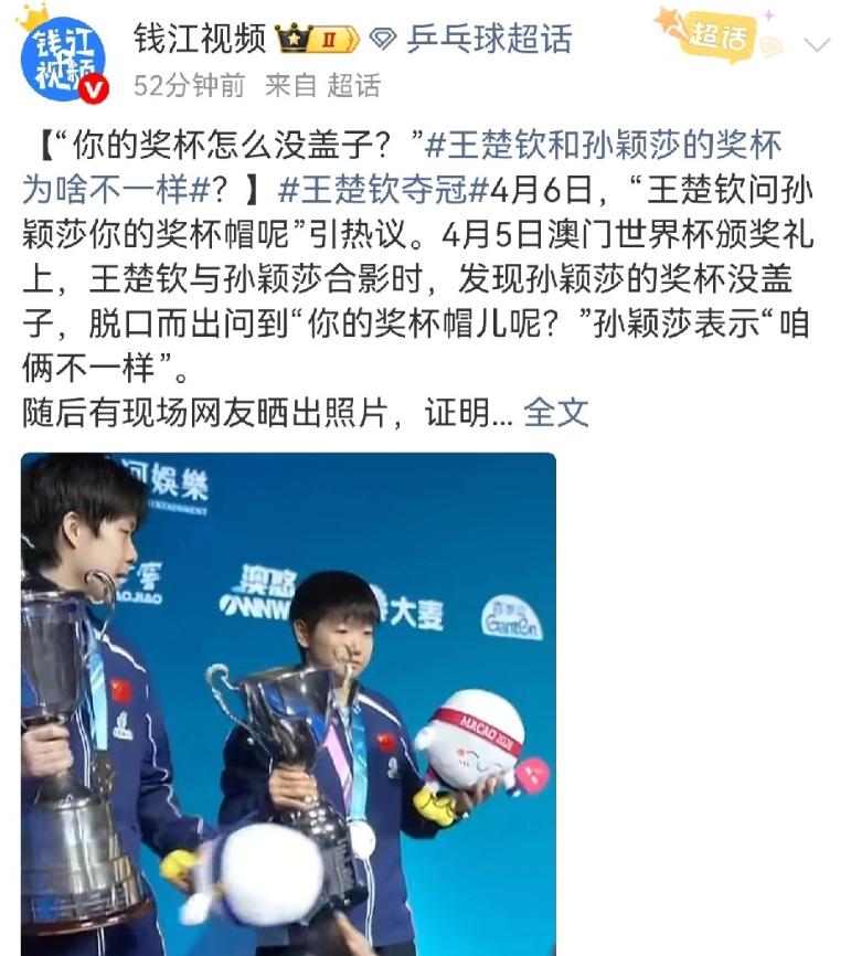 [中国赞]澳门世界杯颁奖礼上,王楚钦一直盯着孙颖莎的奖杯,突然冒出一句:“你的奖杯帽儿呢?”没想到,孙颖莎淡定回了句“咱俩不一样”。