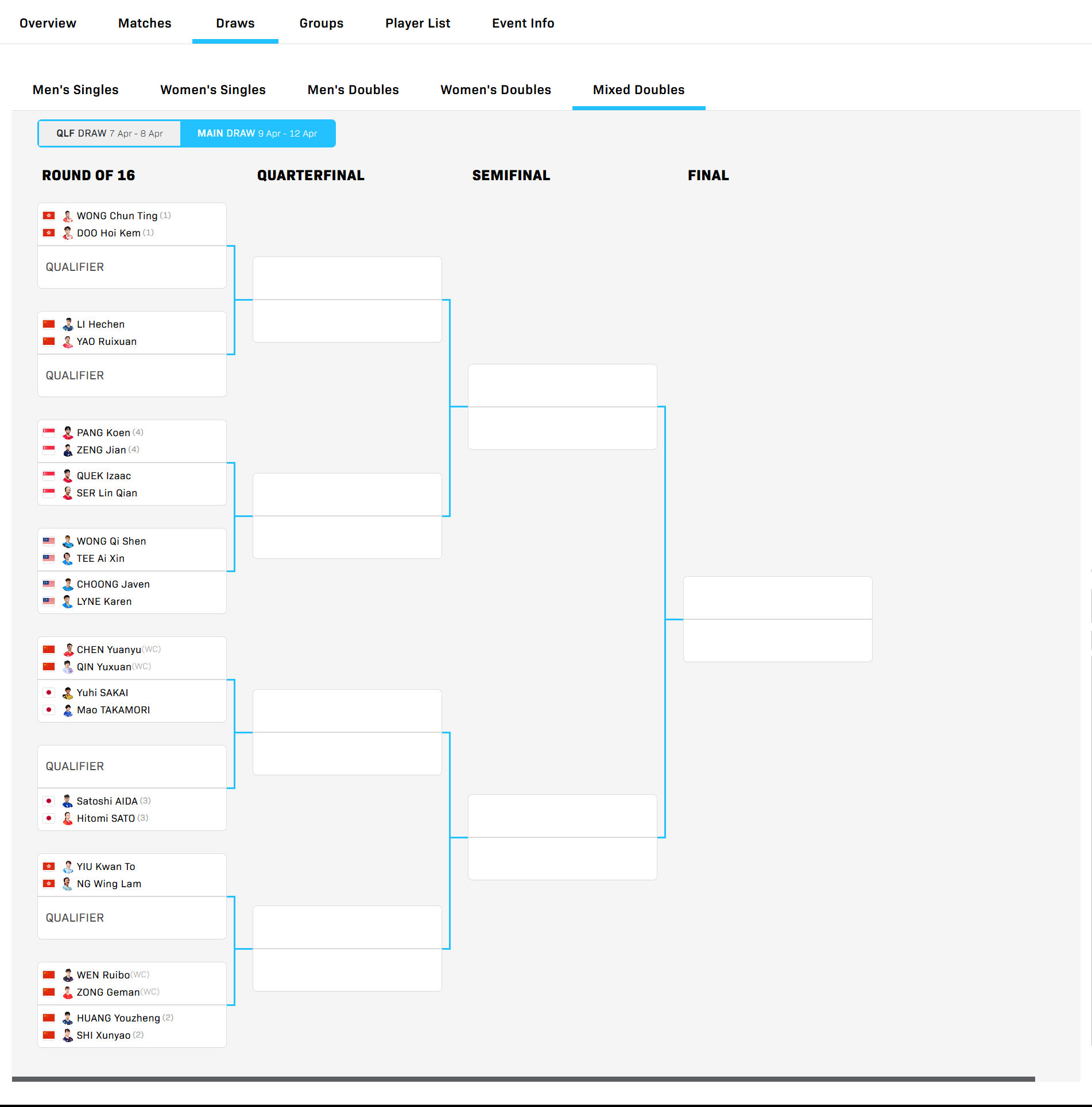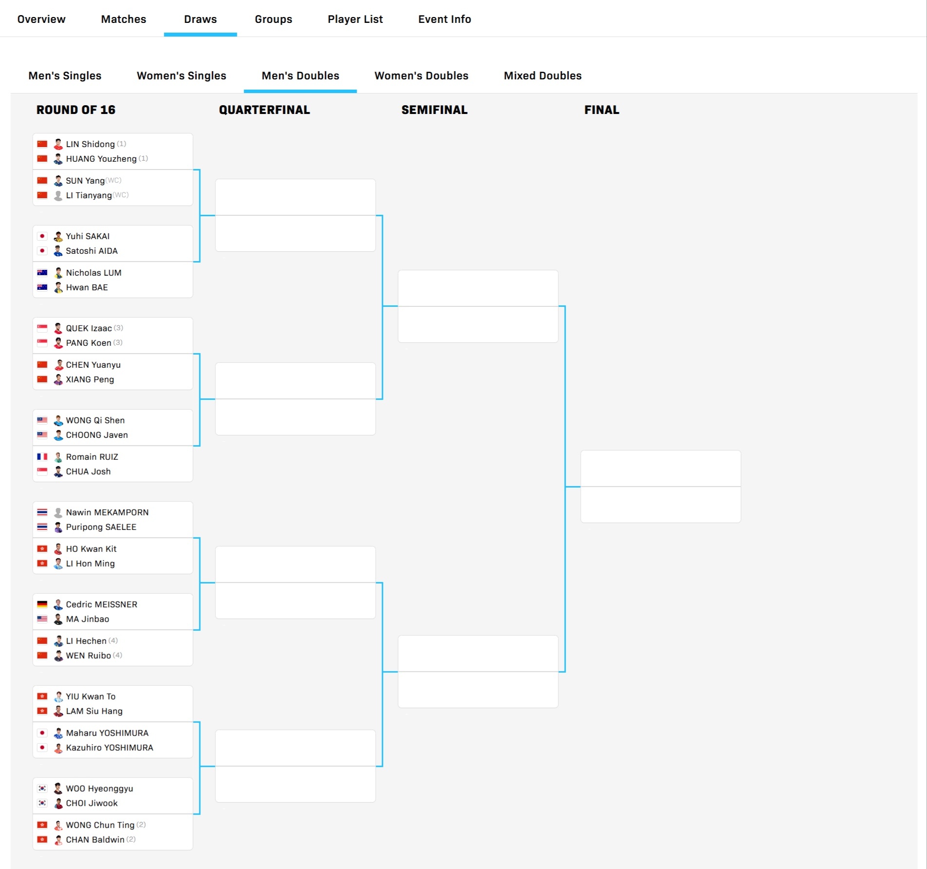 💡男子单打方面黄友政🇨🇳位于2/8区吉山瞭一🇯🇵VS 黄友政🇨🇳 塞德里克·迈斯纳🇩🇪VS 托米斯拉夫·普卡🇭🇷💡男子双打方面林诗栋/黄友政位于1/4区林诗栋/黄友政🇨🇳VS 孙杨/李天阳🇨🇳 英田理志/坂井雄飞🇯🇵VS 林文政/裴焕🇦🇺💡混合双打方面黄友政/石洵瑶位于4/4区姚钧涛/吴咏琳🇭🇰vsQ 温瑞博/纵歌曼🇨🇳VS 黄友政/石洵瑶🇨🇳