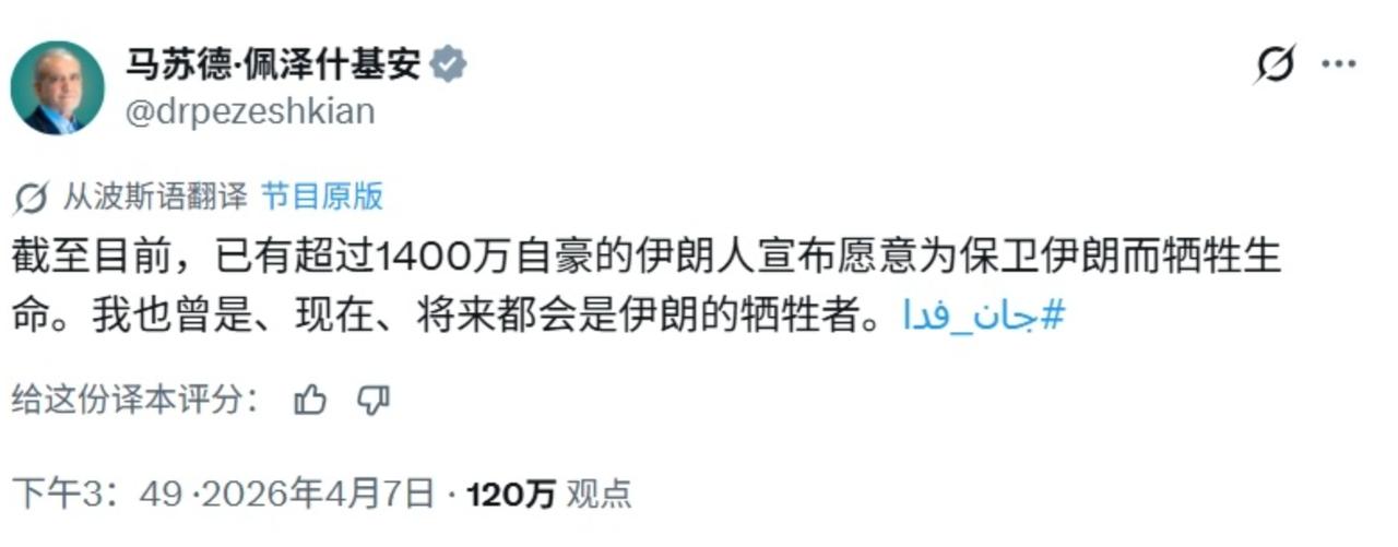 太悲壮了! 伊朗总统佩泽希齐扬表示,自己也做好了为保卫伊朗而牺牲的准备。 想