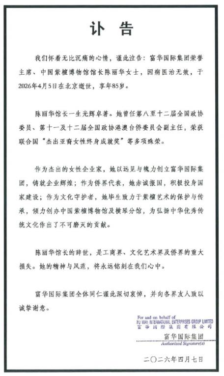 富华国际集团刚发了讣告,“紫檀女王”陈丽华,4月5号在北京走了,享年85岁。