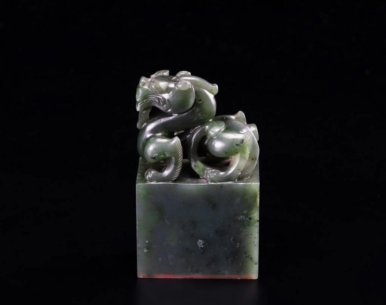 这件清乾隆御制和田青玉龙纽玺,长6.7厘米、宽2.2厘米、高3.9厘米,形状像个小长方盒,顶部蹲着一头威猛玉龙。那龙身壮实,膝盖弯曲,爪子锋利,像随时要扑出去。印面四个字得遂初心,石料透亮,深绿中夹着橄榄绿和黑点,摸着就觉得古人手艺牛到爆。