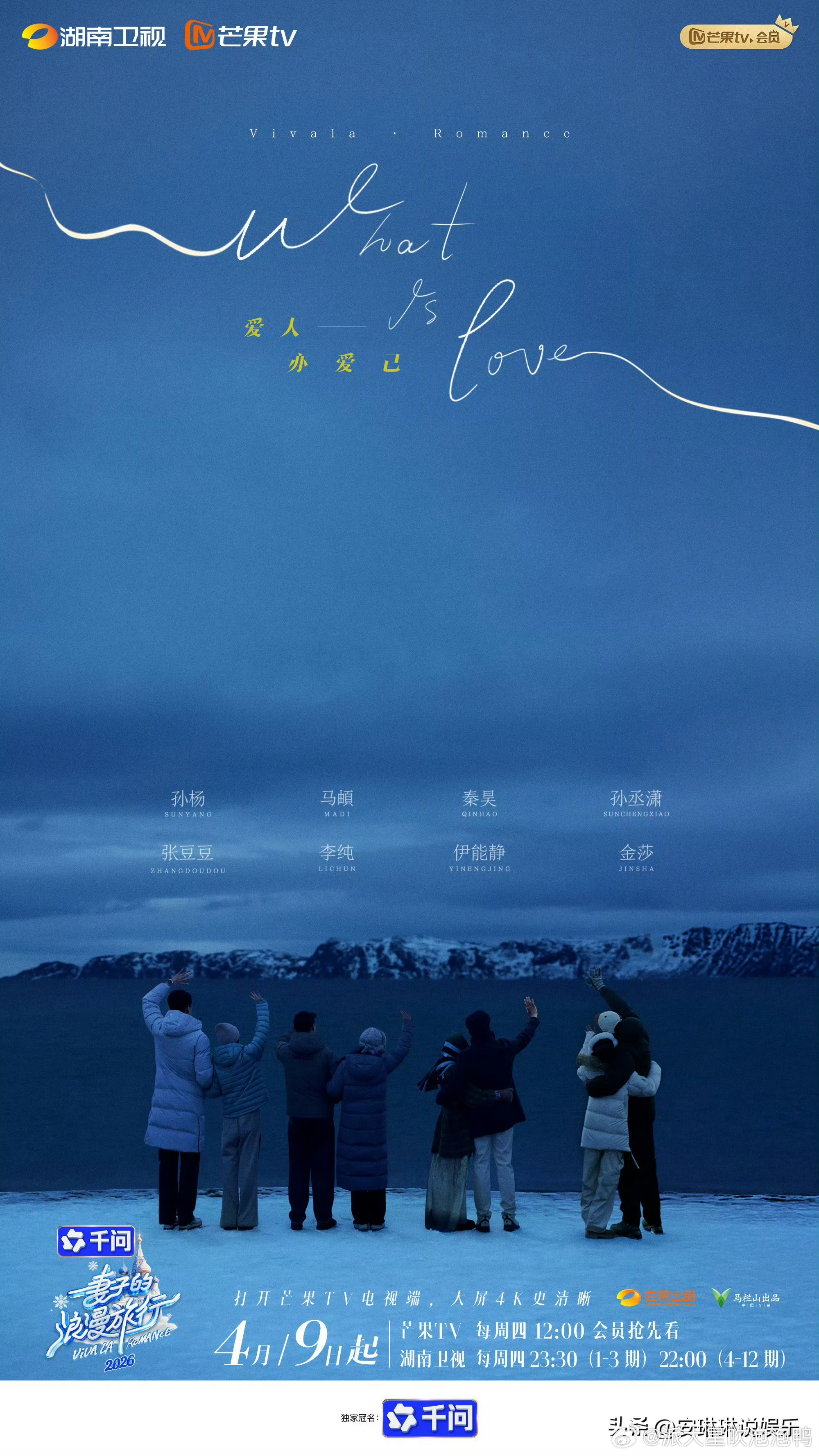 妻子的浪漫旅行全新嘉宾阵容官宣啦第一对金莎和孙丞潇第二对李纯和马頔第三对孙杨和张豆豆第四对秦昊和伊能静 每一对都自带看点,画风多样甜度超标,已经很狠期待正片开播,不过四对嘉宾三对已婚,唯独金莎孙丞潇没领证,这是“妻子”旅行还是“情侣”旅行?