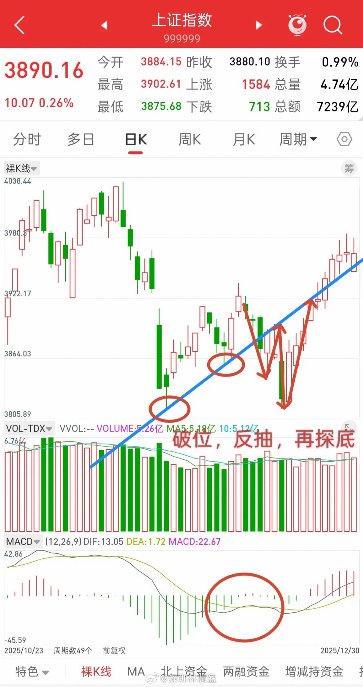 短期来看,大盘未必直接下探,也有可能先反弹至3930-3940附近,随后再回踩探底。底部大概率落在3850附近,极端情况也可能到3800一带,完成最后一轮洗盘后,再向上冲击前高4025。