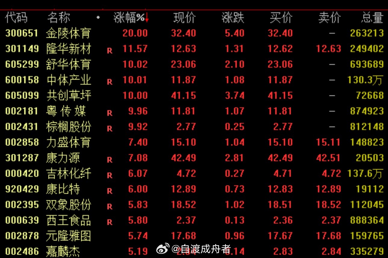 体育概念活跃体育概念盘中震荡走高,截至收盘,金陵体育20%涨停,隆华新材涨超10%,舒华体育、中体产业、共创草坪、粤传媒等均涨停。