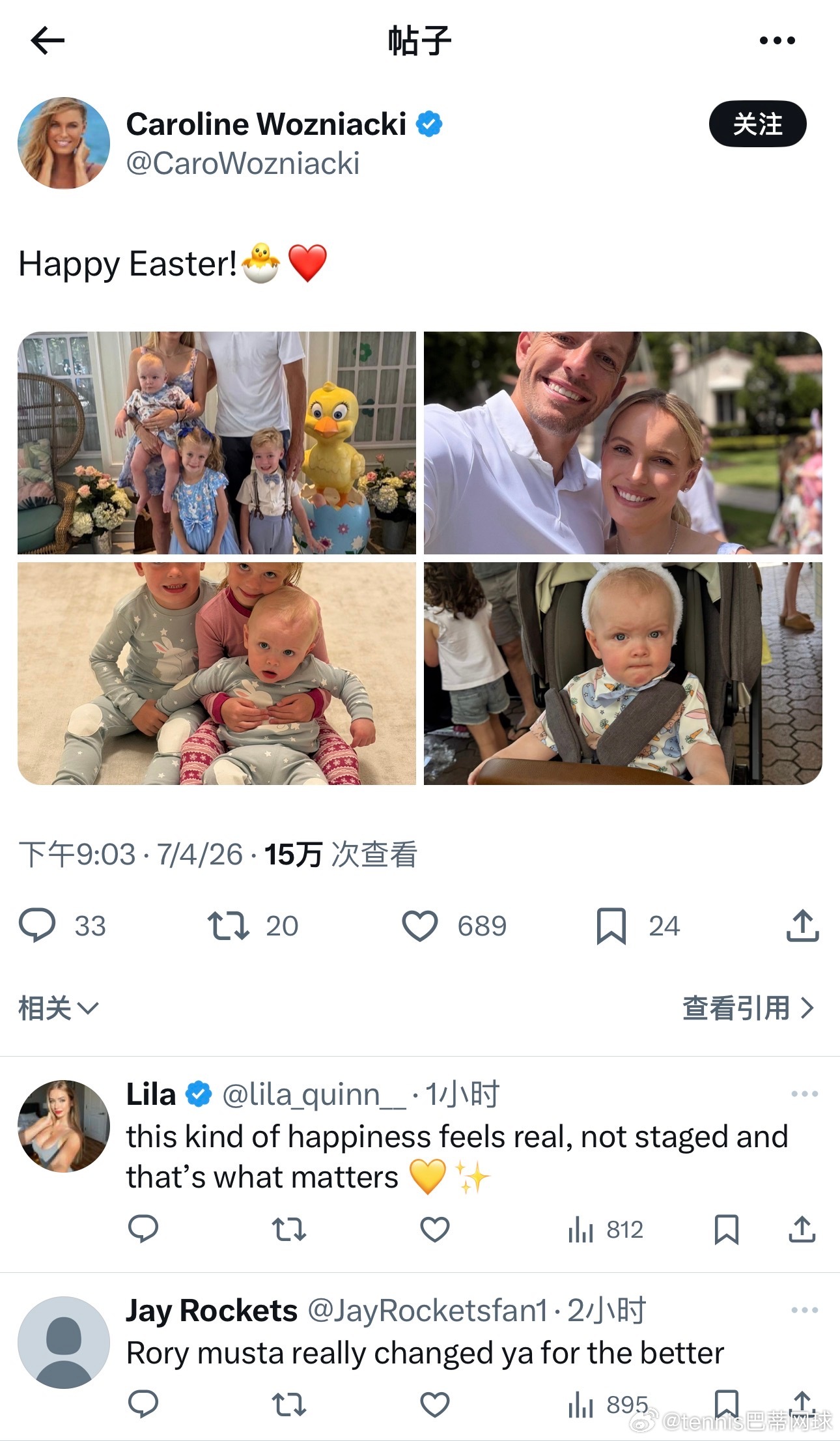 沃兹尼亚奇🇩🇰发推:复活节快乐;帅气多金的老公大卫李,活泼可爱三个子女,如此美满生活还会复出打比赛吗🤔wta