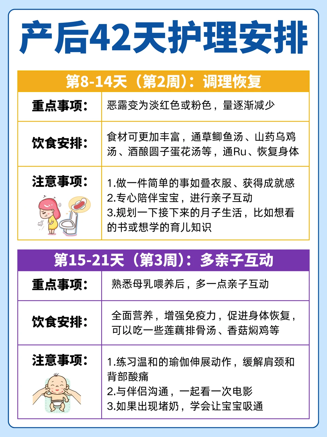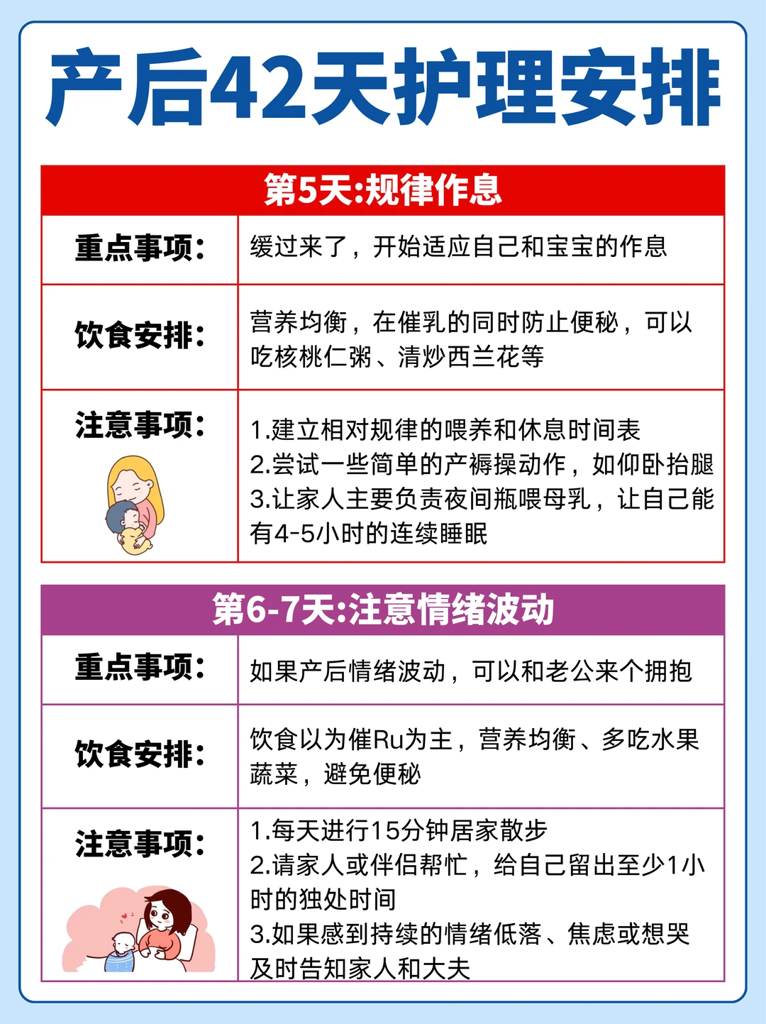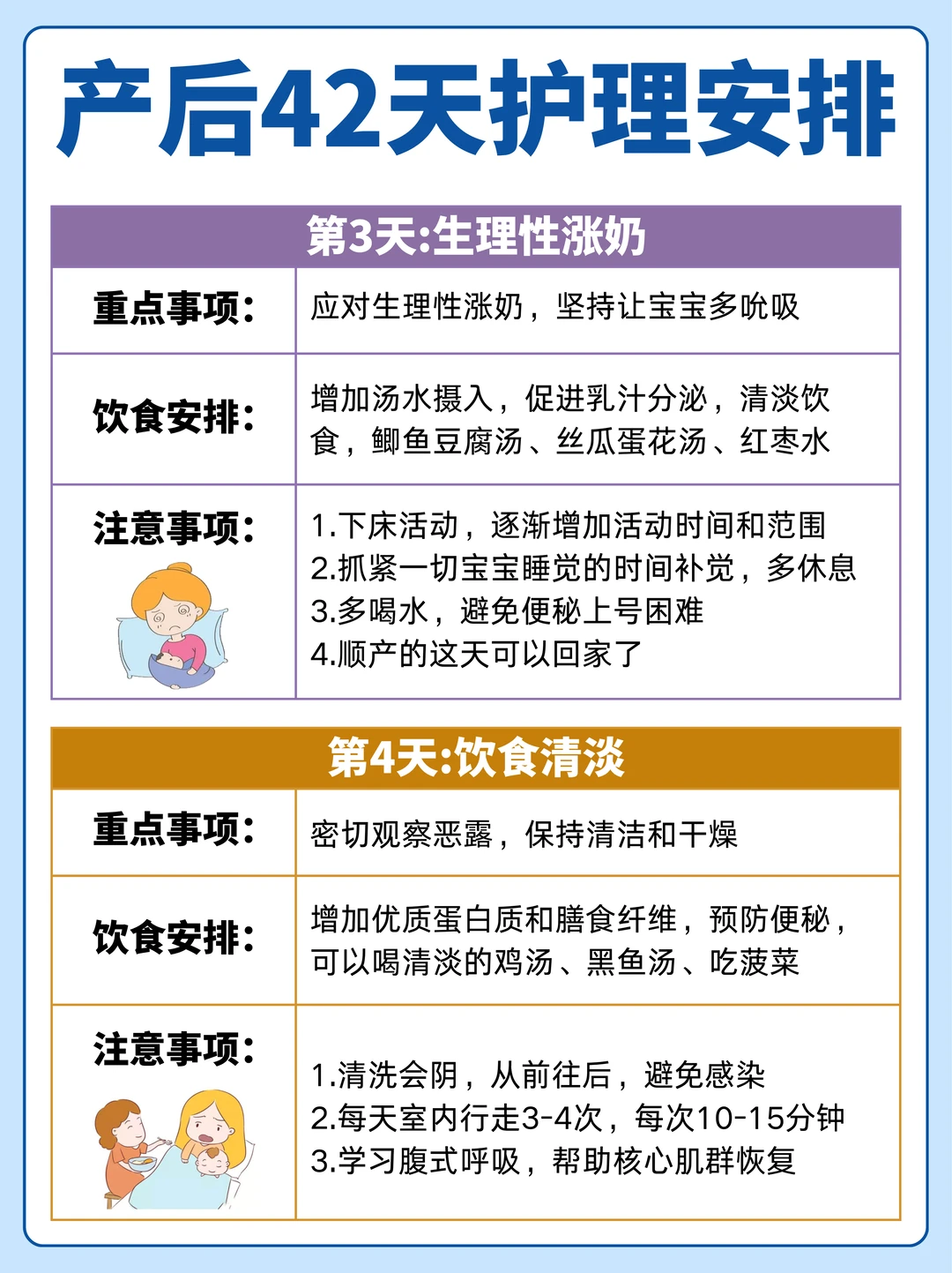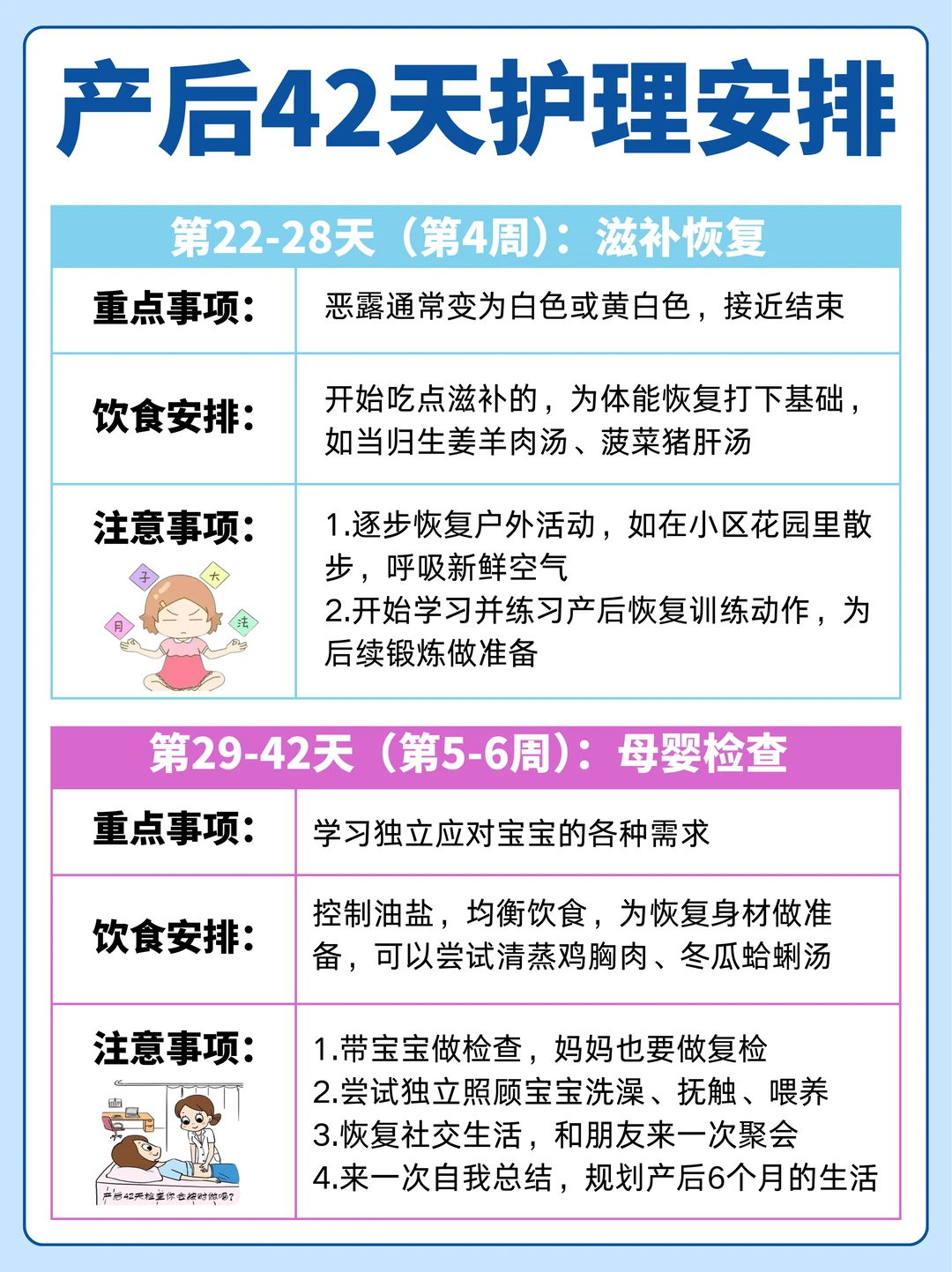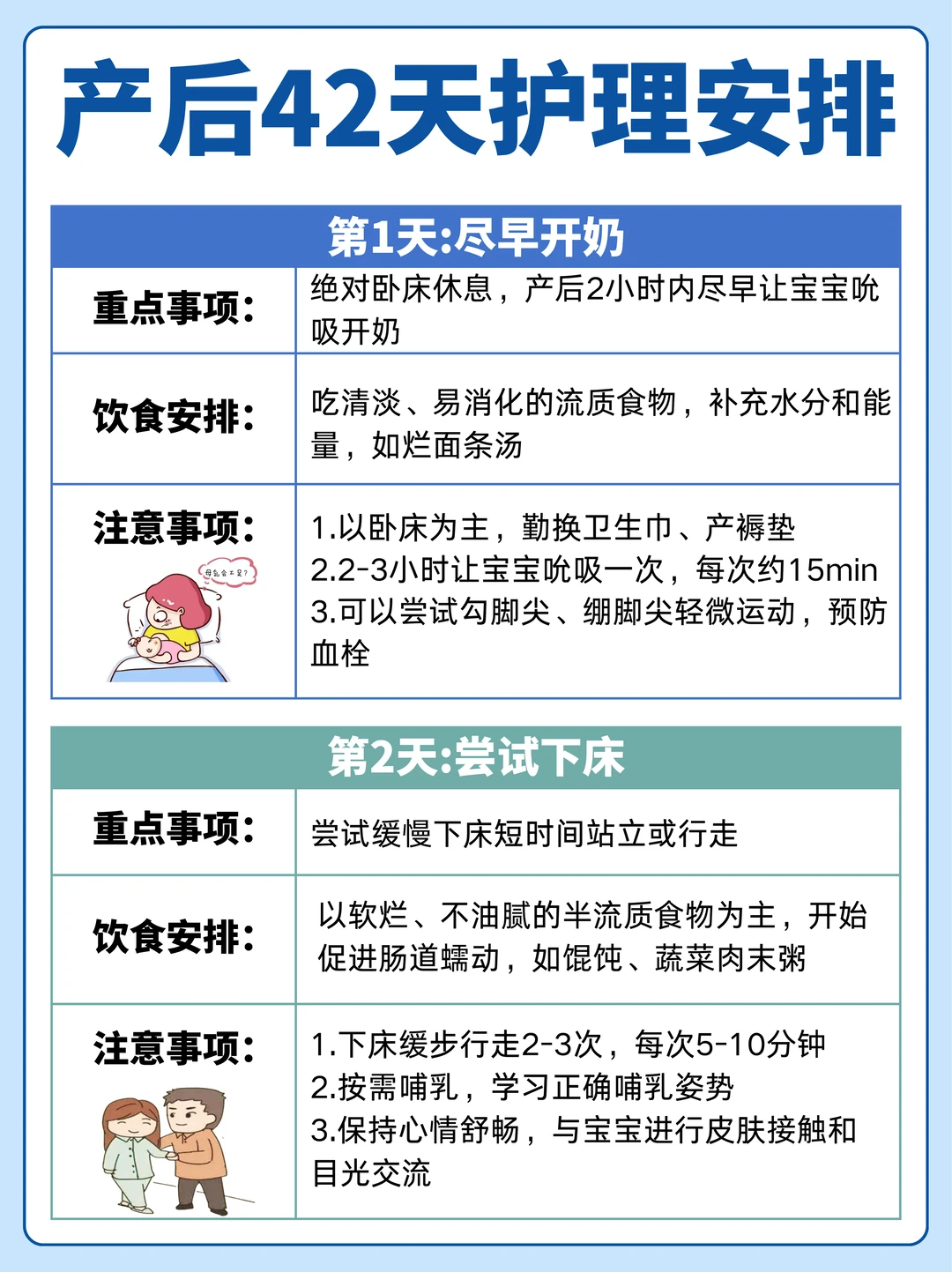 产后复查别忽视!42天后记得带宝宝一起回医院检查。妈妈:子宫复旧、伤口、盆底肌功能、母乳喂养情况。 宝宝:生长发育、黄疸值、疫苗接种。 紧急就医指征:体温≥38℃、剧烈腹痛、大量出血、乳房红肿热痛(乳腺炎)。