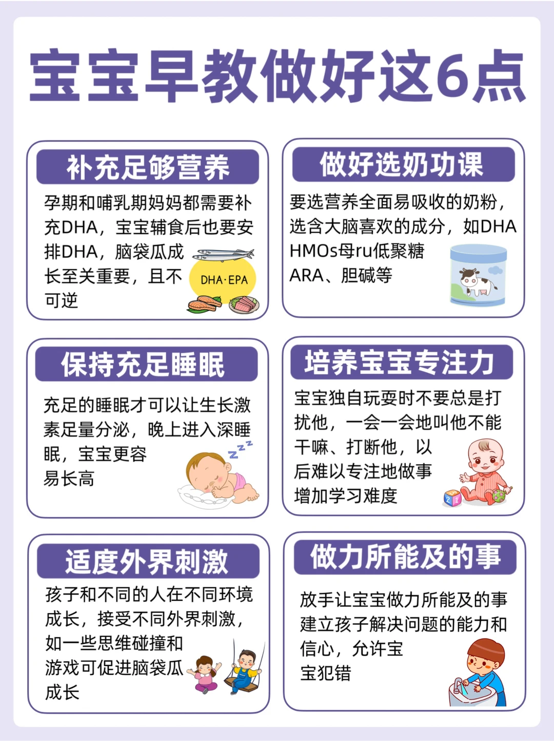 早教的本质,是给婴儿提供各种条件,促进其能力全面均衡发展。大体包括智力发展、社会适应、语言启蒙、认知启蒙、大运动发展、精细动作六大方面。