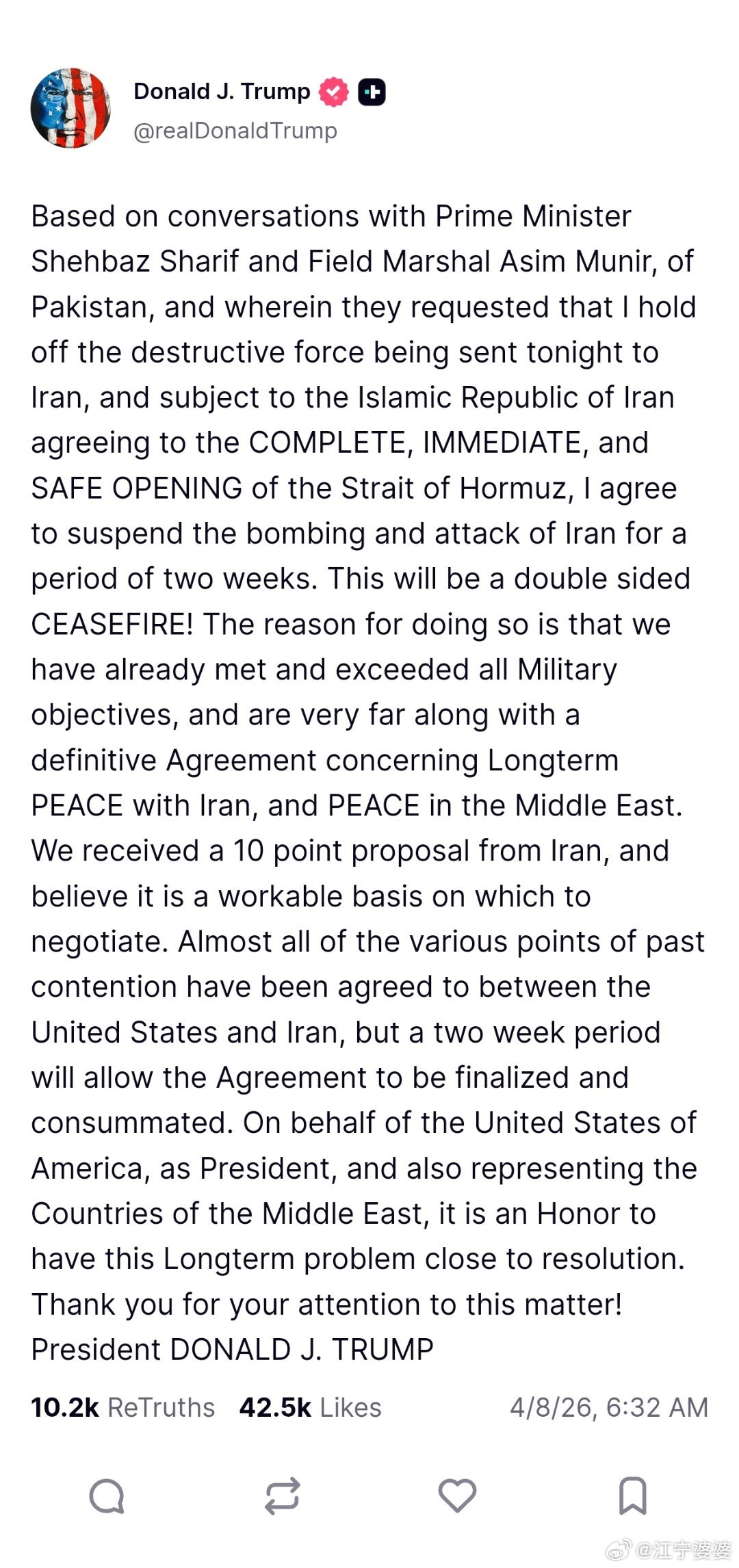 4月8日的川皇:【我们收到了伊朗提出的10条条件,我们认为这将成为谈判基础。暂时停火两周,谈判!我们和伊朗几乎所有的争议都已经很完善啦】↘️