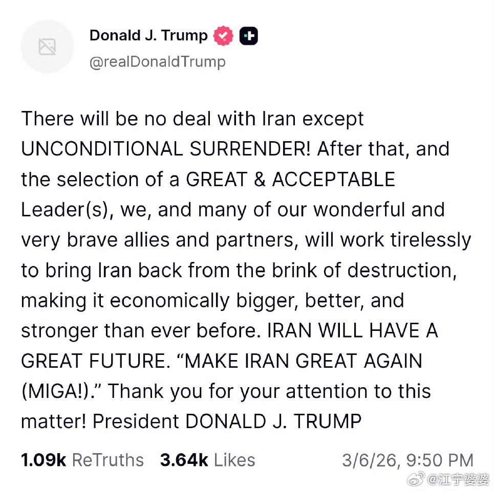 3月6日的川皇:【除非伊朗无条件投降,否则不会与之达成任何协议!】↙️