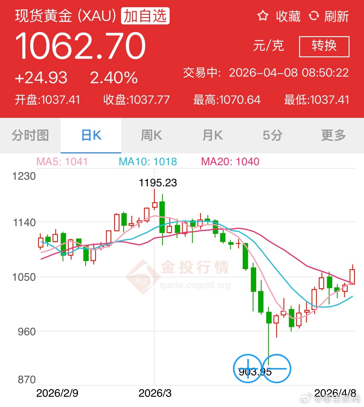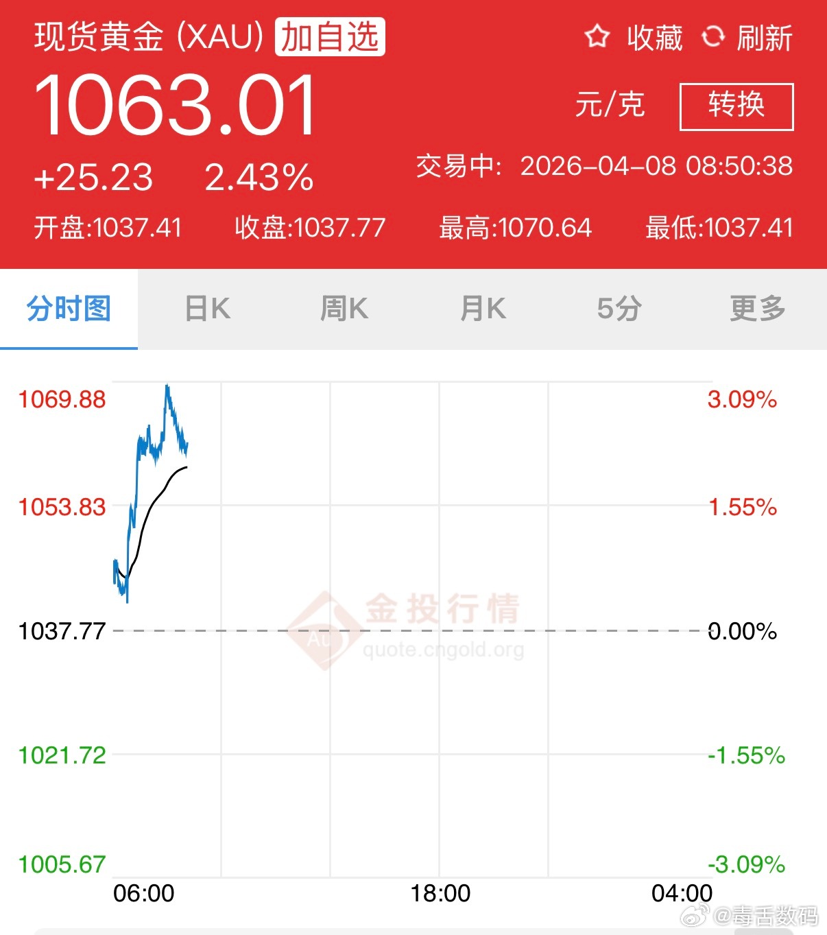 黄金金价大涨,国际金价4800左右,国内预计1060左右,很多人1060上车的吧