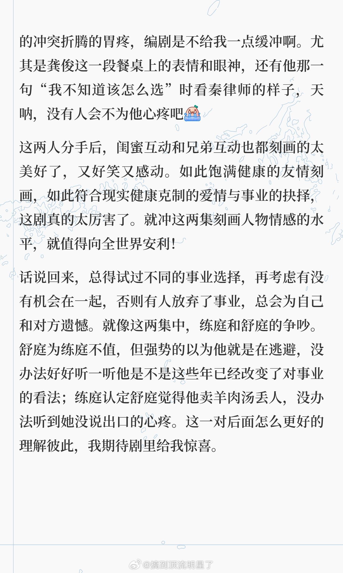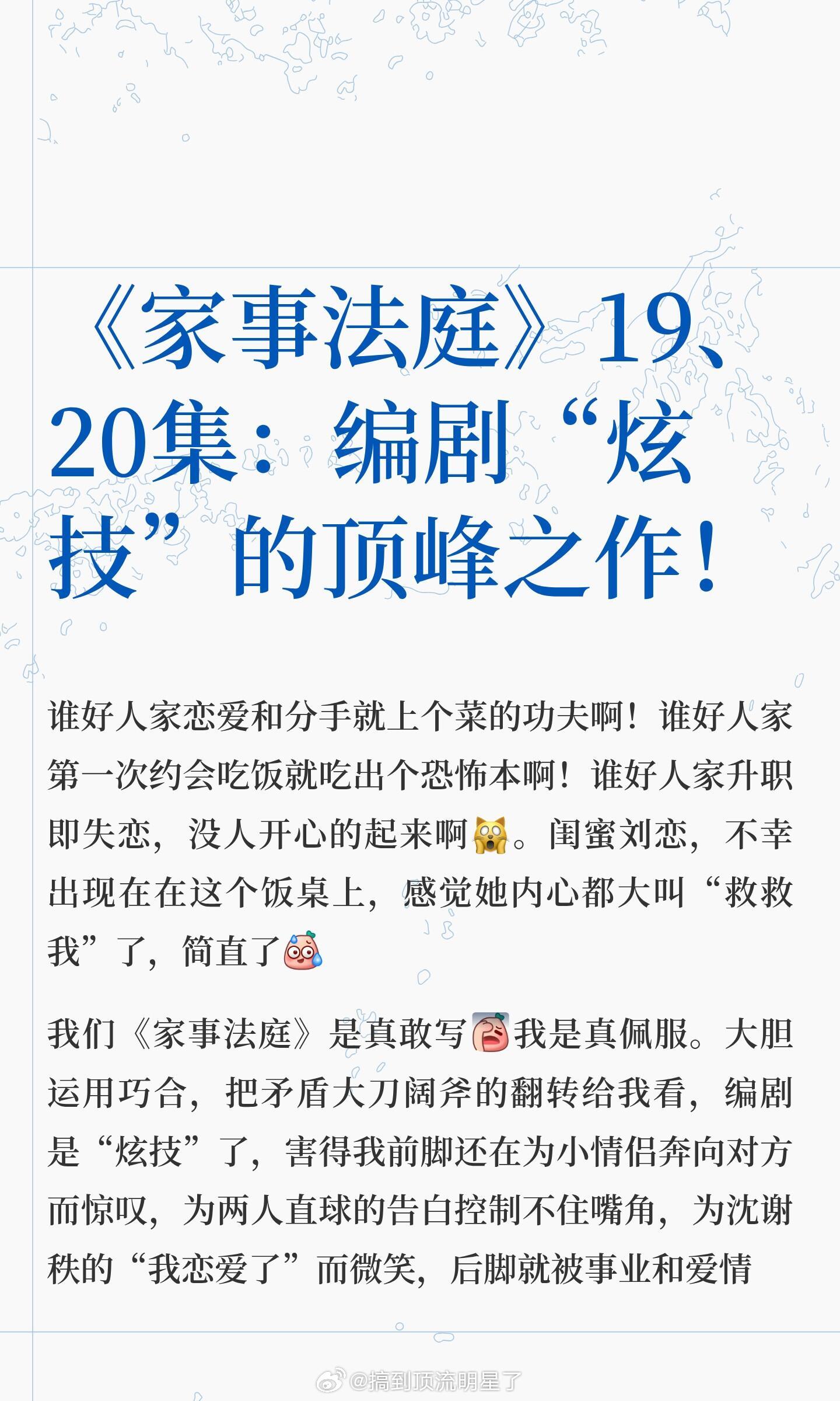 《家事法庭》19、20集不仅是编剧的炫技之作,更是导演和演员的炫技之作!编剧对矛盾的呈现,对节奏的把控,给女主的选择;导演对镜头的掌控,对氛围的营造;演员对角色的诠释,在不同场景下、不同人生阶段里的拉扯都体现的淋漓尽致。这剧真的太好看了,龚俊真的很会选剧本,粉丝可以永远相信他的眼光家事法庭
