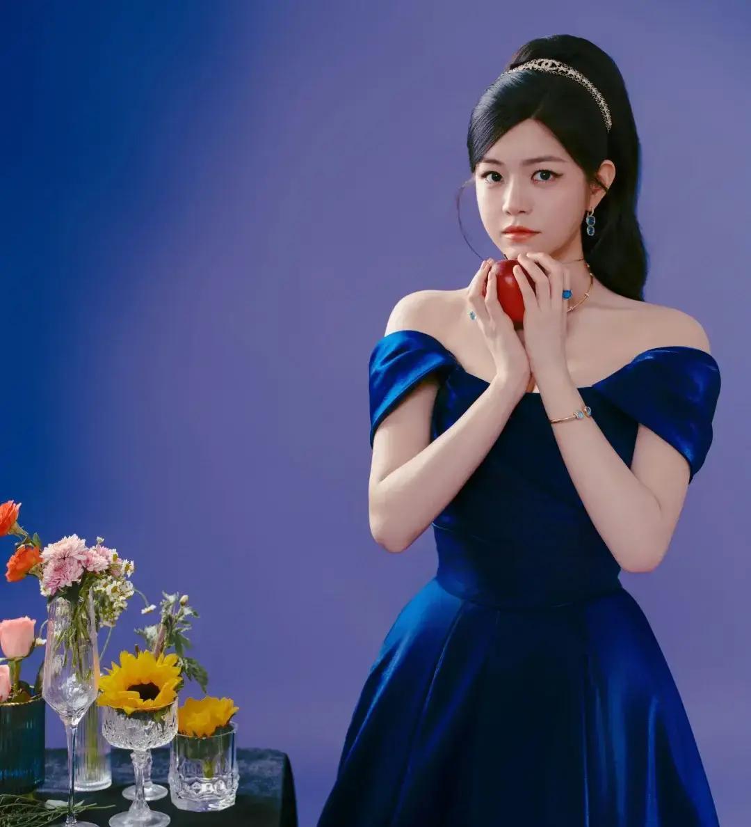 深蓝丝绒裹身,层层纱摆配珍珠蝴蝶结,公主头乌发垂落,皮肤白到发光,五官甜美梨涡依旧。镜头扫过,她整个人像从童话里走出来,现场C位稳稳拿捏。