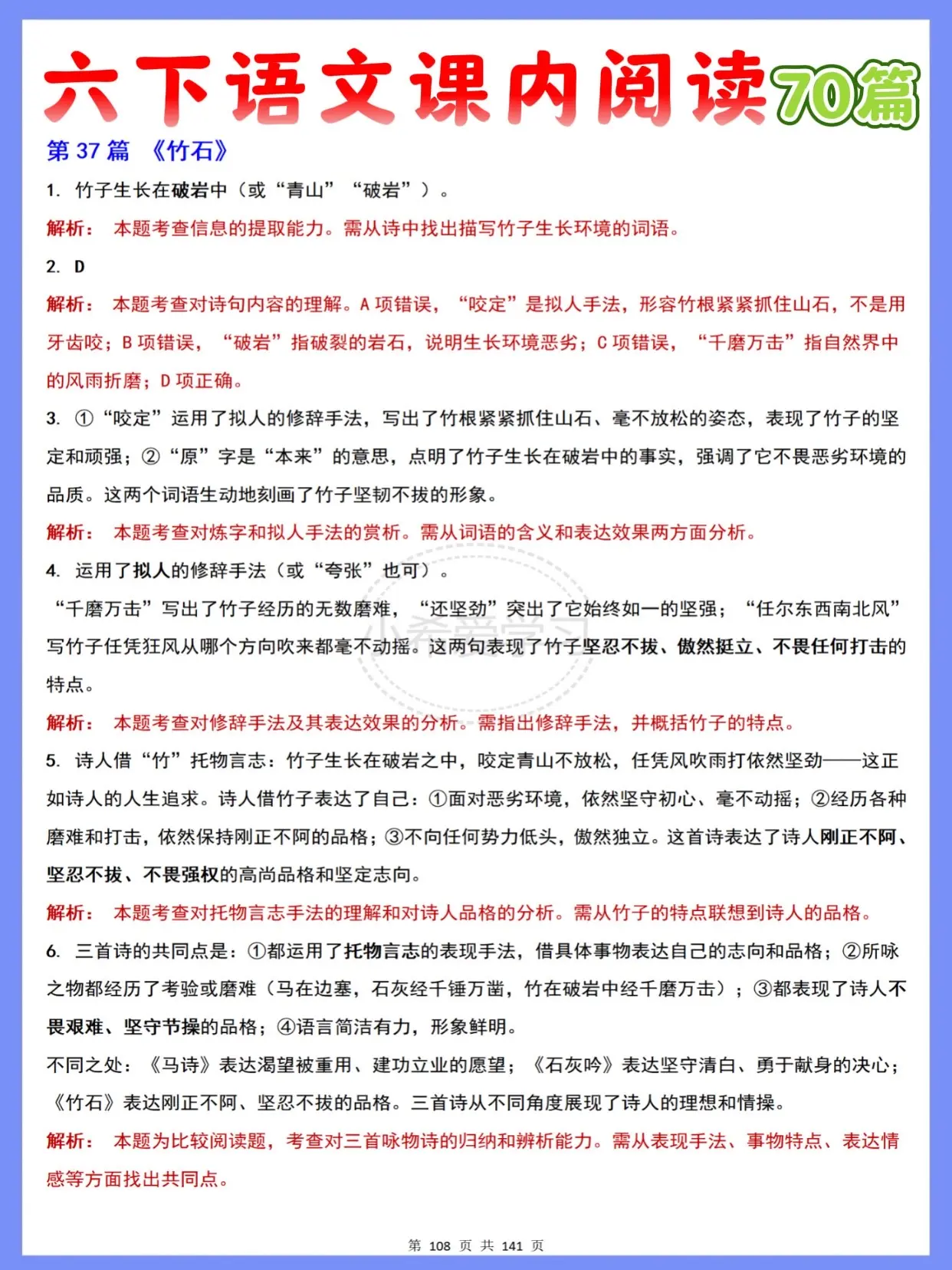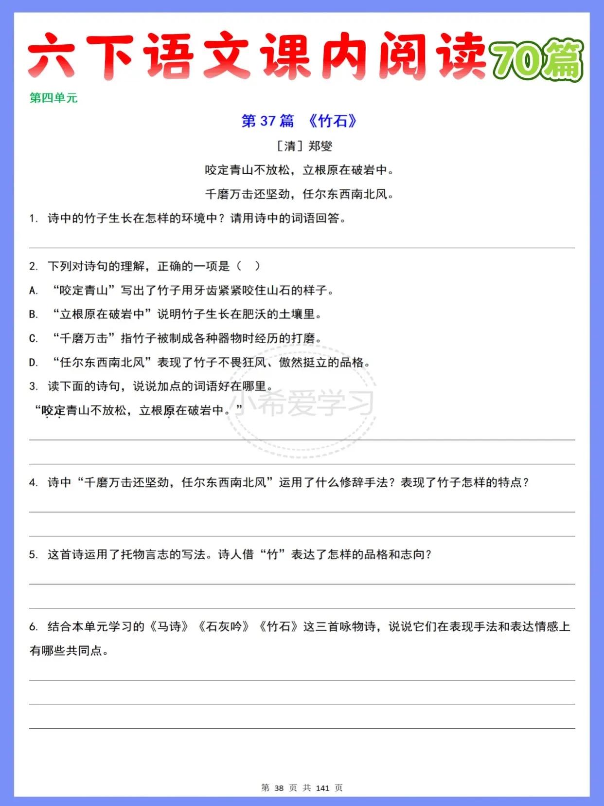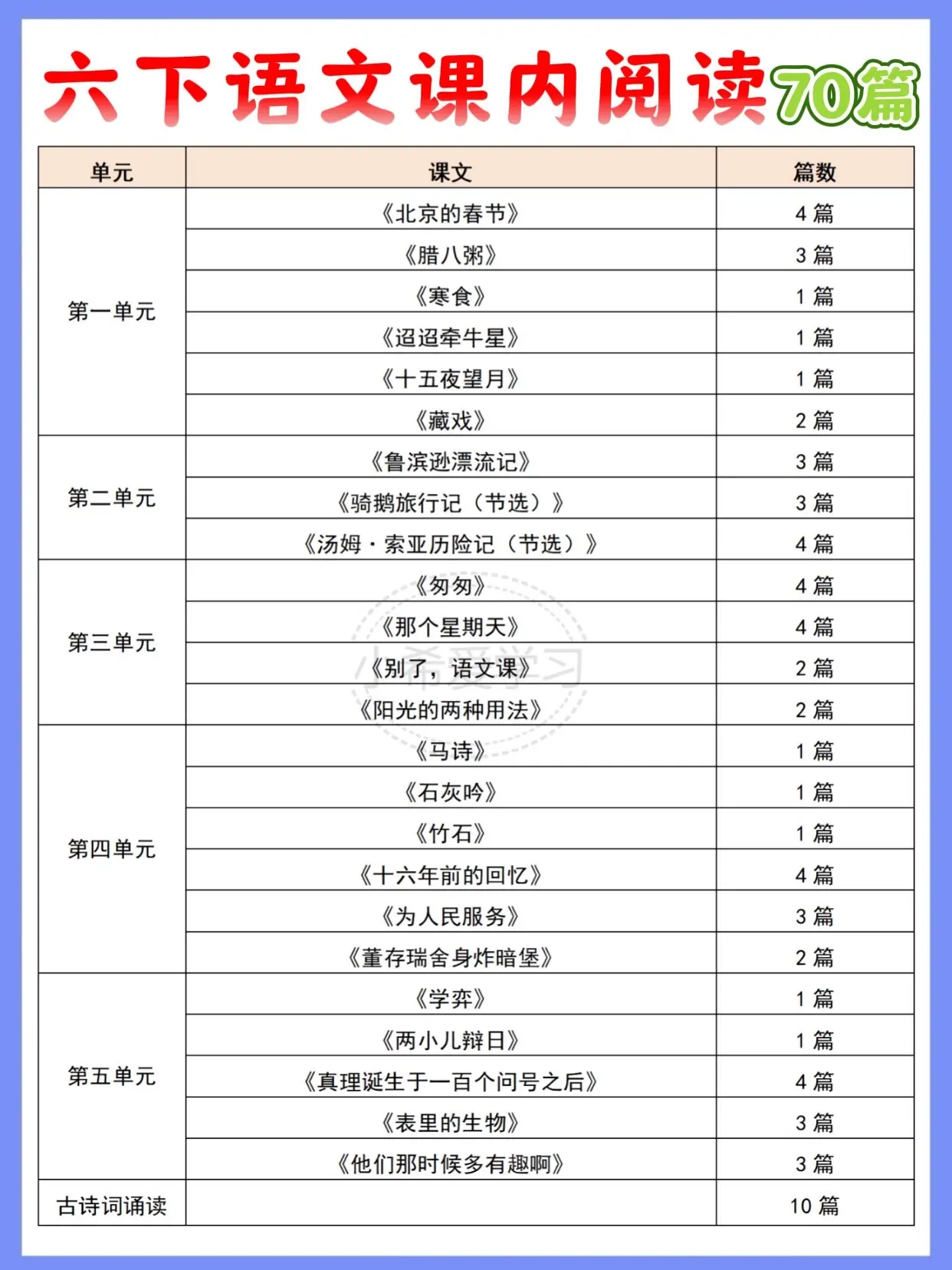涵盖六年级下册语文1-6单元全册课文,还有古诗词诵读专项,一共70篇精选篇目,每篇都紧扣课本考点,日常练习、期末复习都超好用~