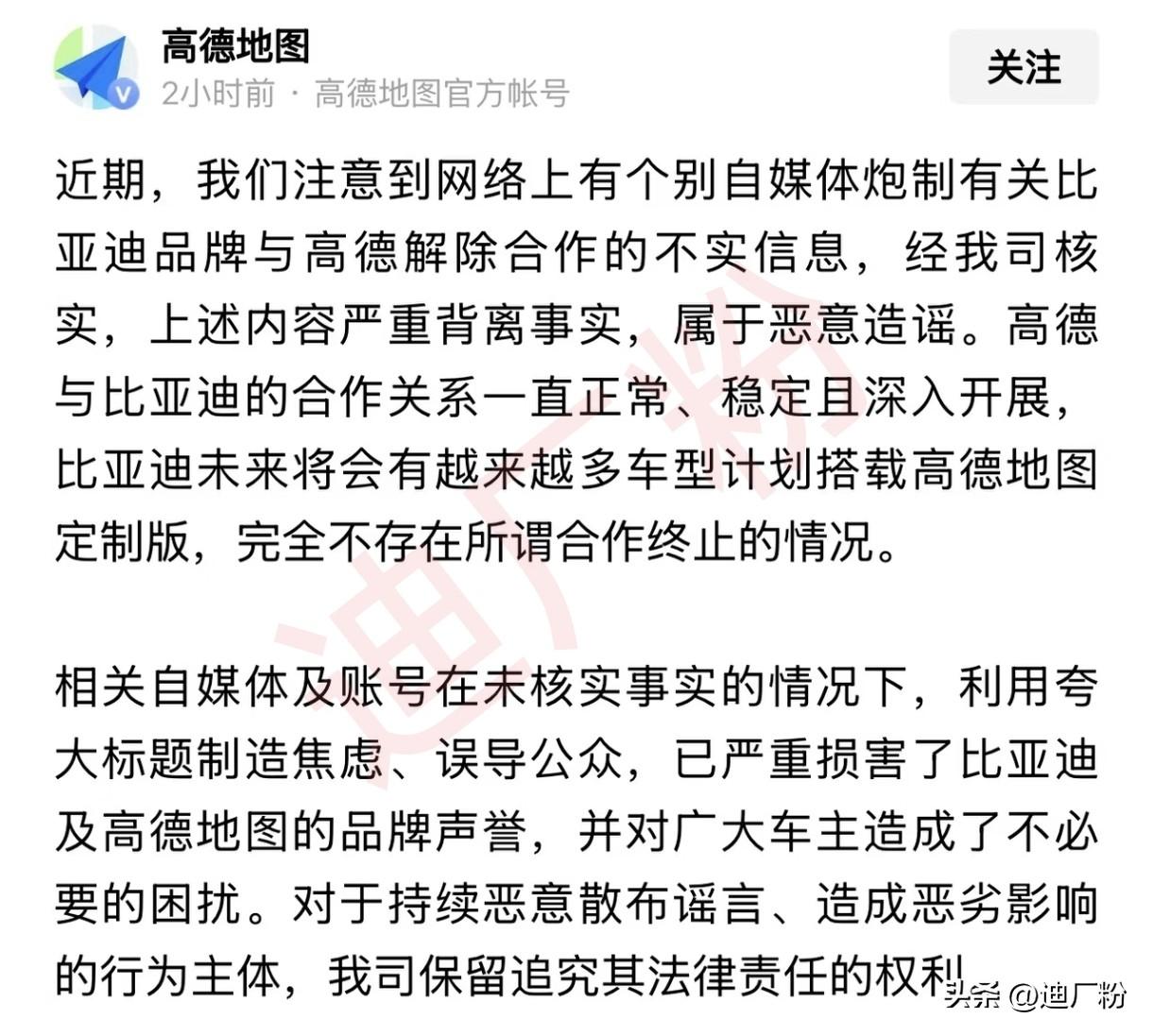 对此,高德地图官方回复:近期,我们注意到网络上有个别自媒体炮制有关比亚迪品牌与高德解除合作的不实信息,经我司核实,上述内容严重背离事实,属于恶意造谣。高德与比亚迪的合作关系一直正常、稳定且深入开展,比亚迪未来将会有越来越多车型计划搭载高德地图定制版,完全不存在所谓合作终止的情况。