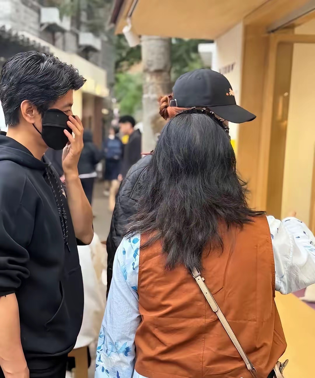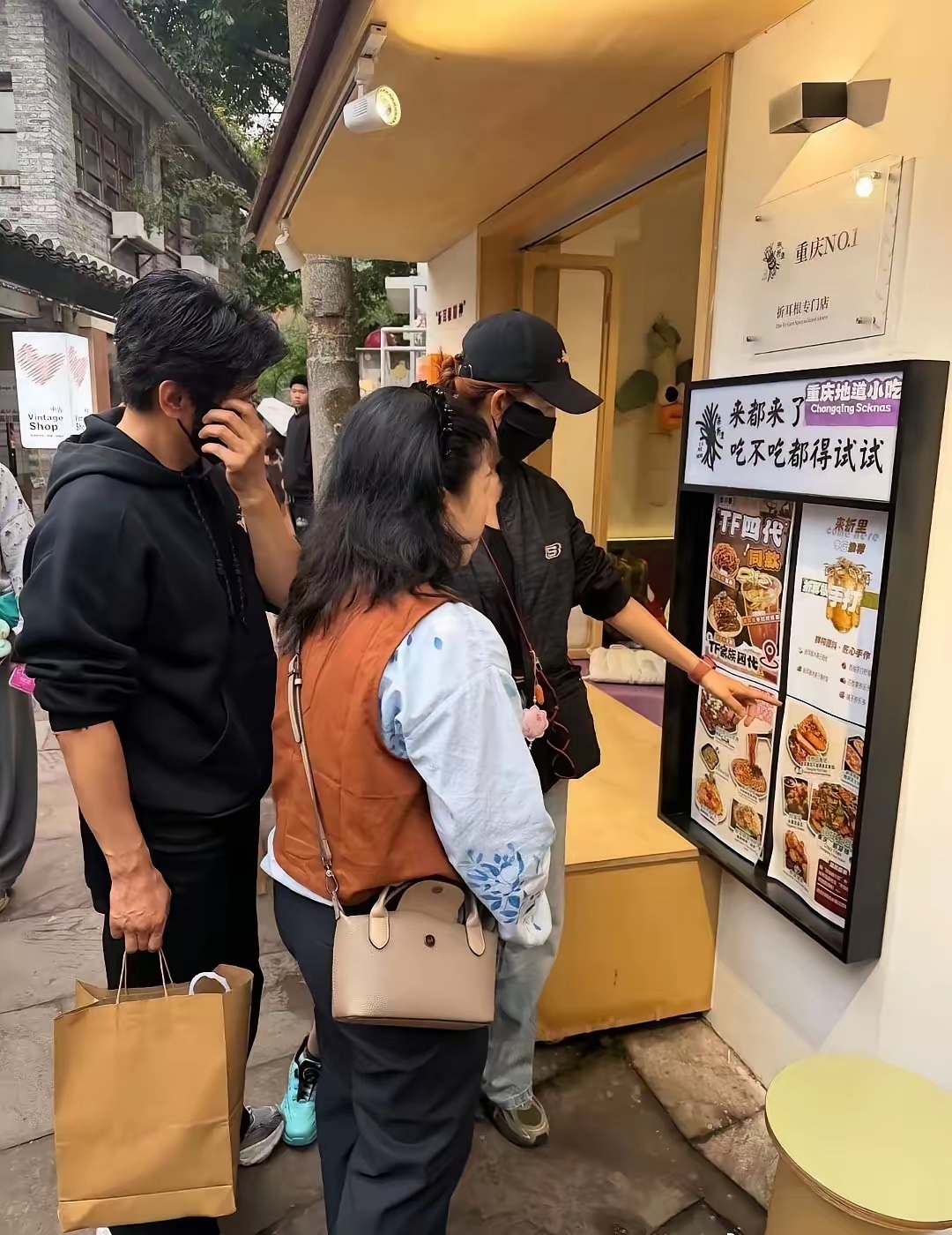 53岁蔡少芬和老公张晋现身重庆旅游,她真人身材很瘦,饮品店买了一杯折耳根茶水,开心拿出手机拍照,真的很接地气!
