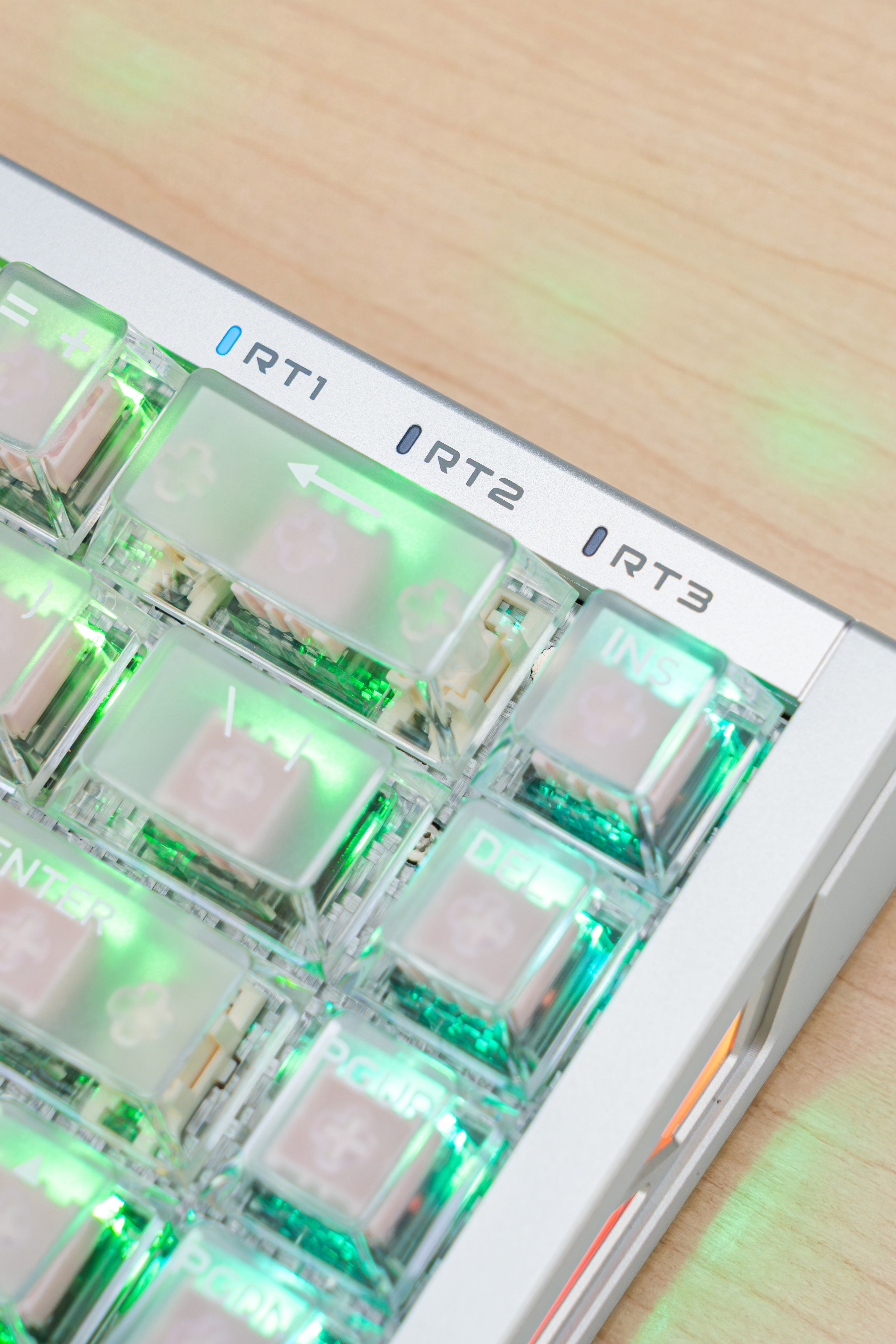 回报率最高可以选到16K,磁轴反正也要插线用,也不用担心耗电问题;它这个外置RT键的设计很喜欢,可以按键切换三套板载磁轴按键设置,可以从正常键程的打字办公直接无缝切换到高灵敏度玩游戏,不用额外进驱动换设置,很方便。