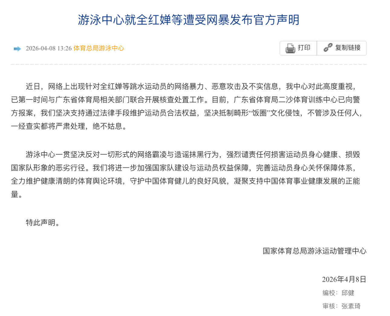 国家游泳中心针对全红婵遭受的网络暴力发表声明,已向警方报案。