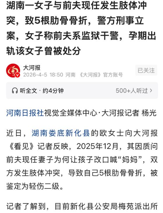 湖南一女子怀二胎期间,发现小自己7岁的丈夫出轨其监狱干警女同事,遂将二人举报,二人被记大过处分。女子随后与丈夫协议离婚,可她前脚离婚,前夫后脚就娶了该女同事。女同事还逼女子孩子叫自己妈妈,女子得知后上门理论,双方发生肢体冲突,女子被打成5处肋骨骨折,对方却反咬她上门滋事。