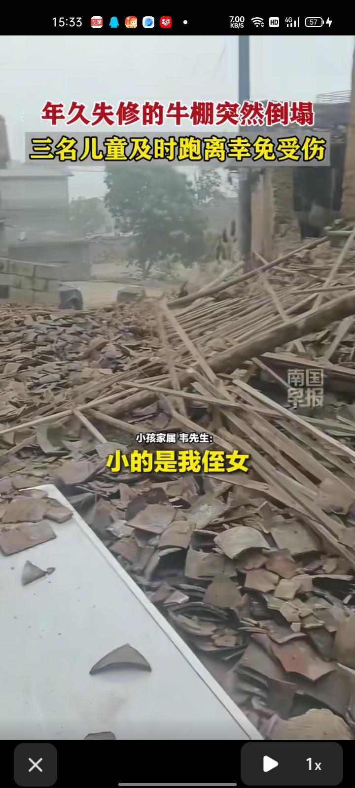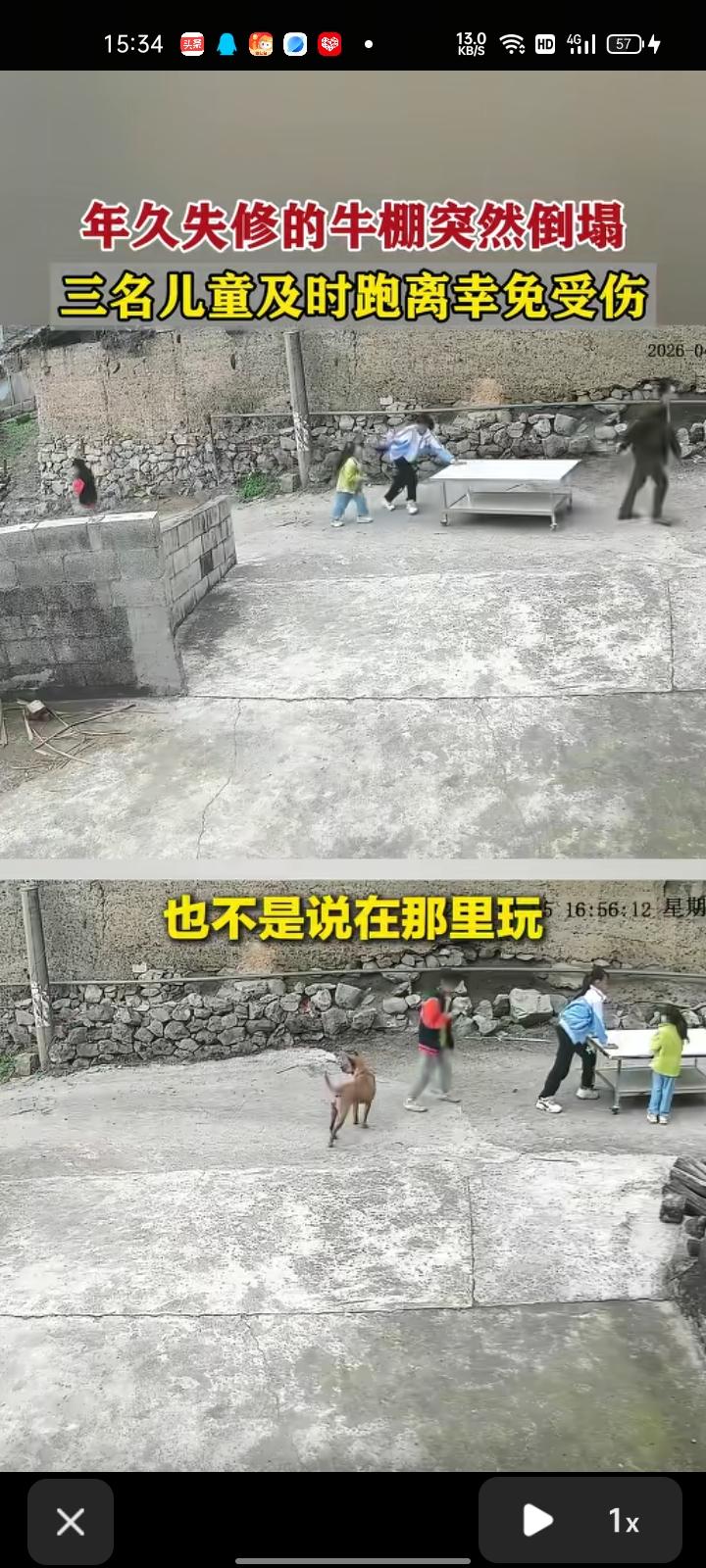 4月5日,广西河池。监控记录惊险一幕,一座废弃牛棚因年久失修突然倒塌,三个小孩迅速跑离,幸免受伤,只是被吓到了。