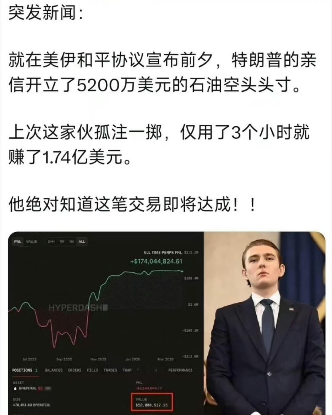 真的赢麻了!冲突期间,M国向鱿鱼狂售几十亿军火,“油阀”们借战势推高页岩油价格赚得盆满钵满。还有,停火消息落地前,金毛们精准做空石油,3小时狂赚1.74亿,精准踩中消息节点引内幕交易质疑。