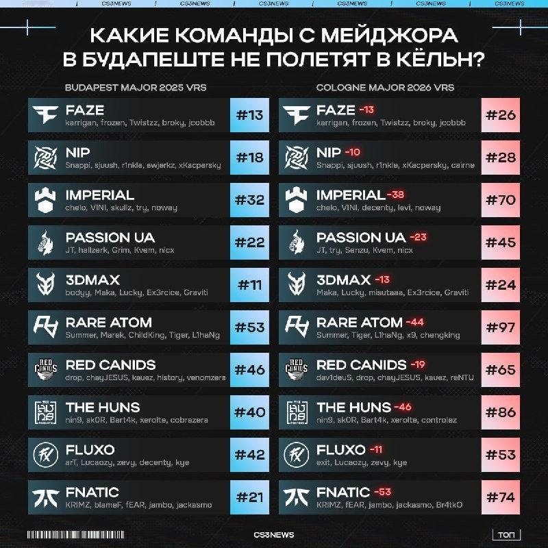 大洗牌!在经过一个月激烈的二线线下赛争夺后,IEM科隆Major邀请的排名已正式敲定。而去年参加布达佩斯Major的队伍中,中有足足十支队伍无缘本届科隆Major,其中就包含夺得亚军的FaZe!