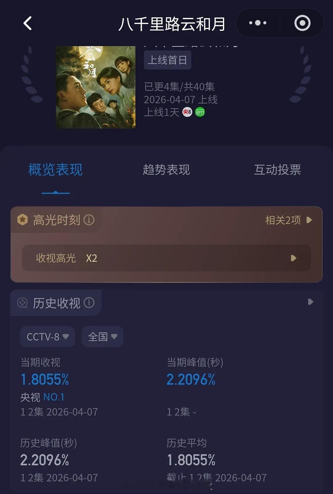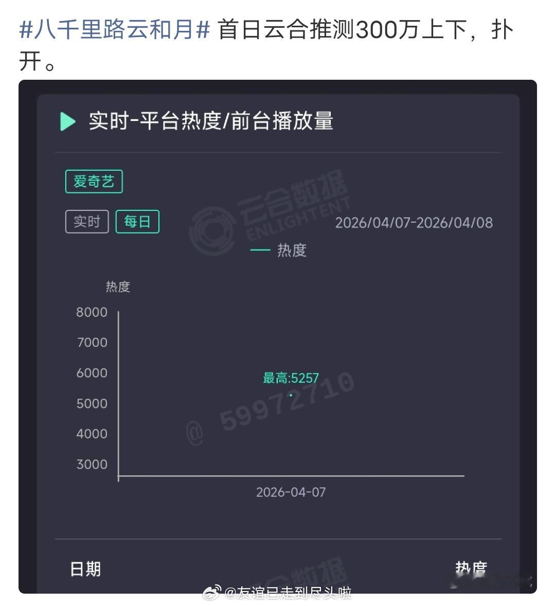 爱奇艺剧王首日数据已坠机王阳万茜《八千里路云和月》开局3广,首日热度只有5257,首日云合300左右,酷云平均1.8055,可以说是全方位拉胯,盖章扑开。《觉醒年代》的班底,绝对的细糠,还拉到于和伟客串,题材也是爷奶最爱,播成这样真的没理由甩锅吧。。。八千里路云和月