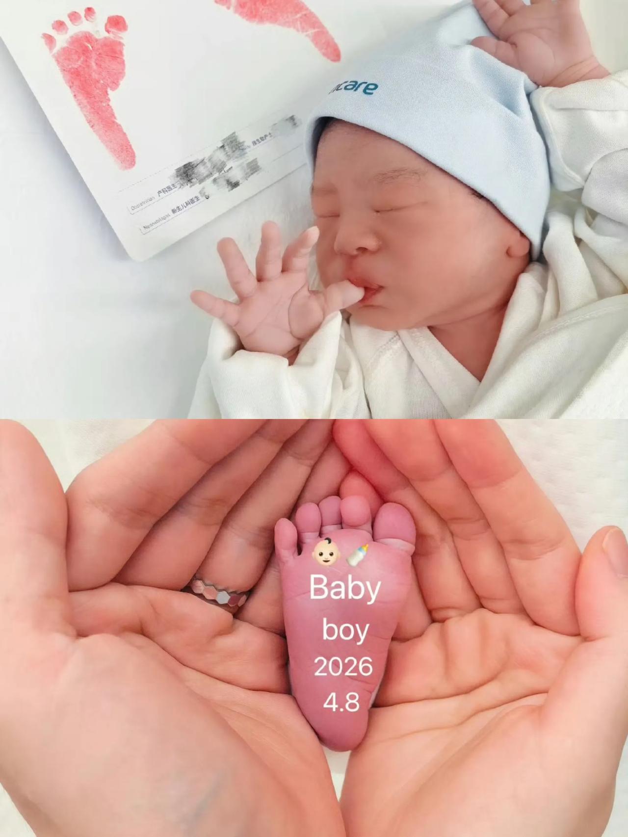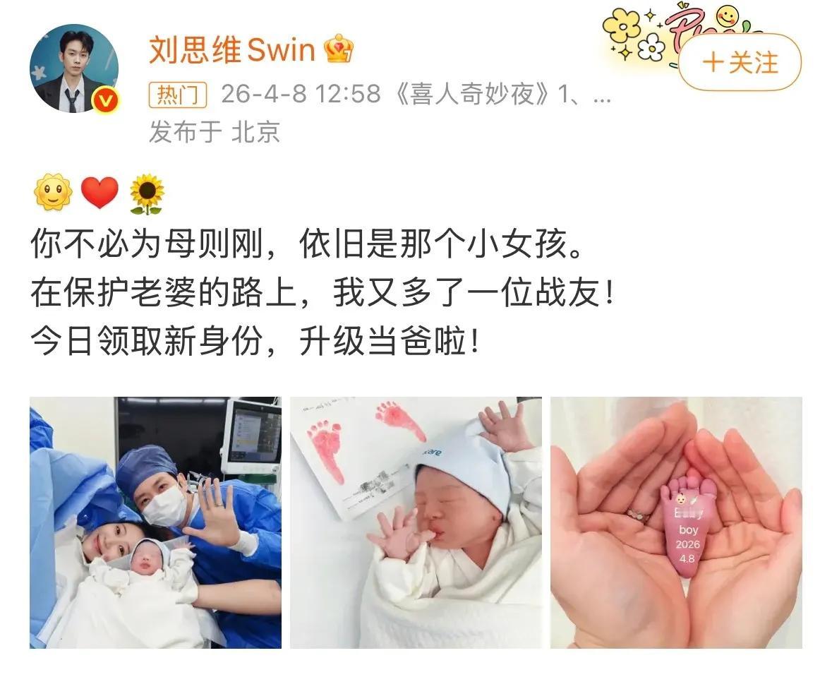 他在配文中深情告白妻子:“你不必为母则刚,依旧是那个小女孩。在保护老婆的路上,我又多了一位战友!” 还晒出一家三口的合影,纪念脚印上也清晰地标注了是个可爱的“Baby Boy”。