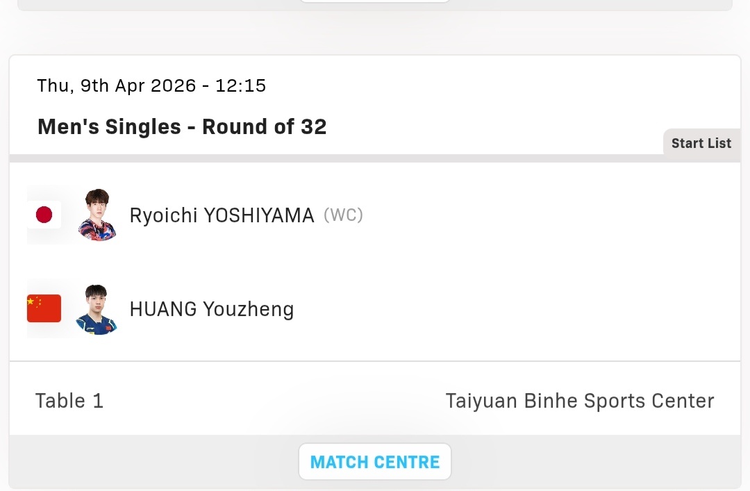 🔎男子单打方面⏰北京时间12:15💡球台:T1🏷男子单打1/16决赛🆚黄友政🇨🇳VS吉山瞭一🇯🇵