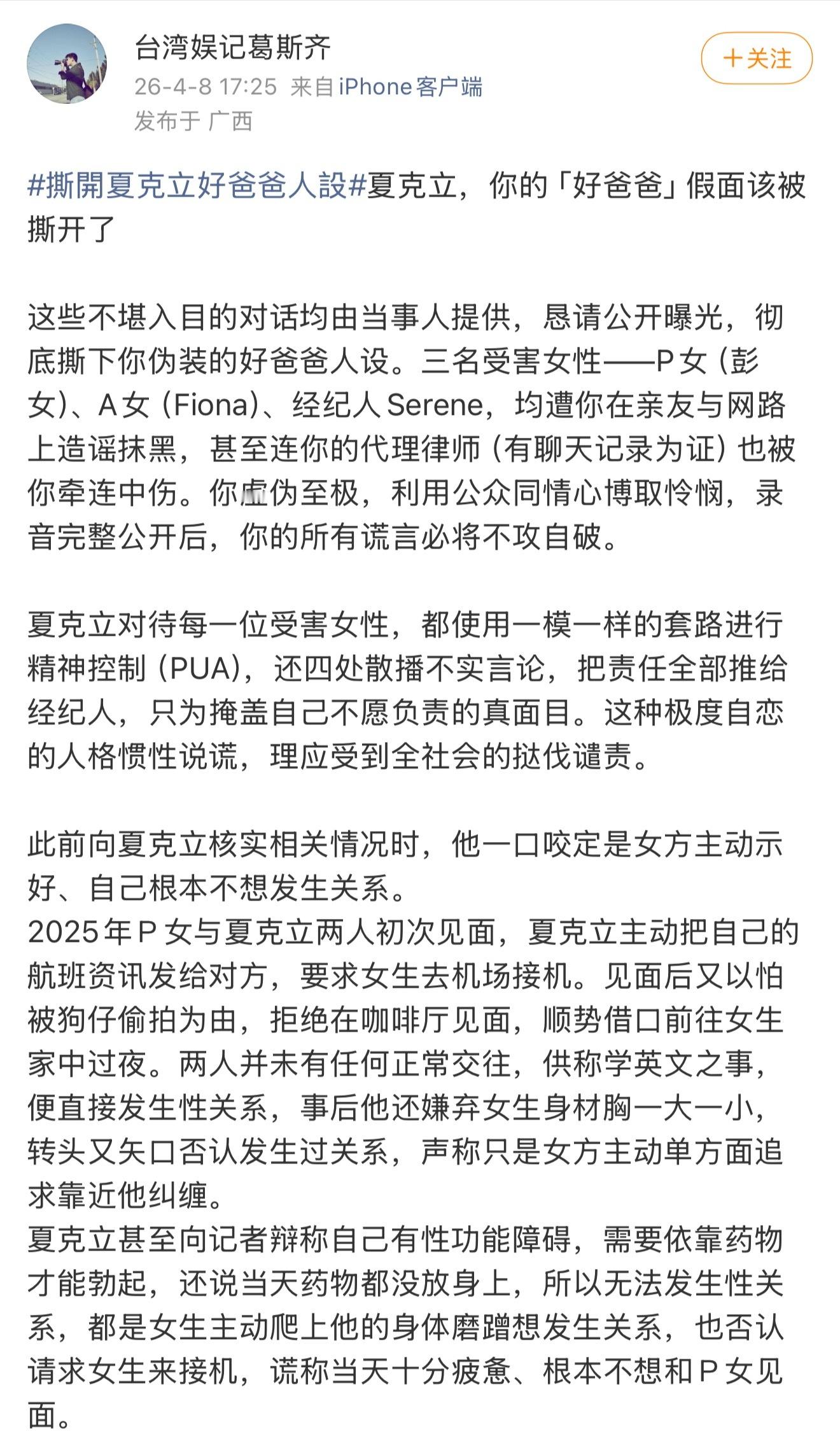 葛斯齐再发文控诉夏克立 葛斯齐再发文控诉夏克立,称夏克立用相同套路pua了每一位受害女性: