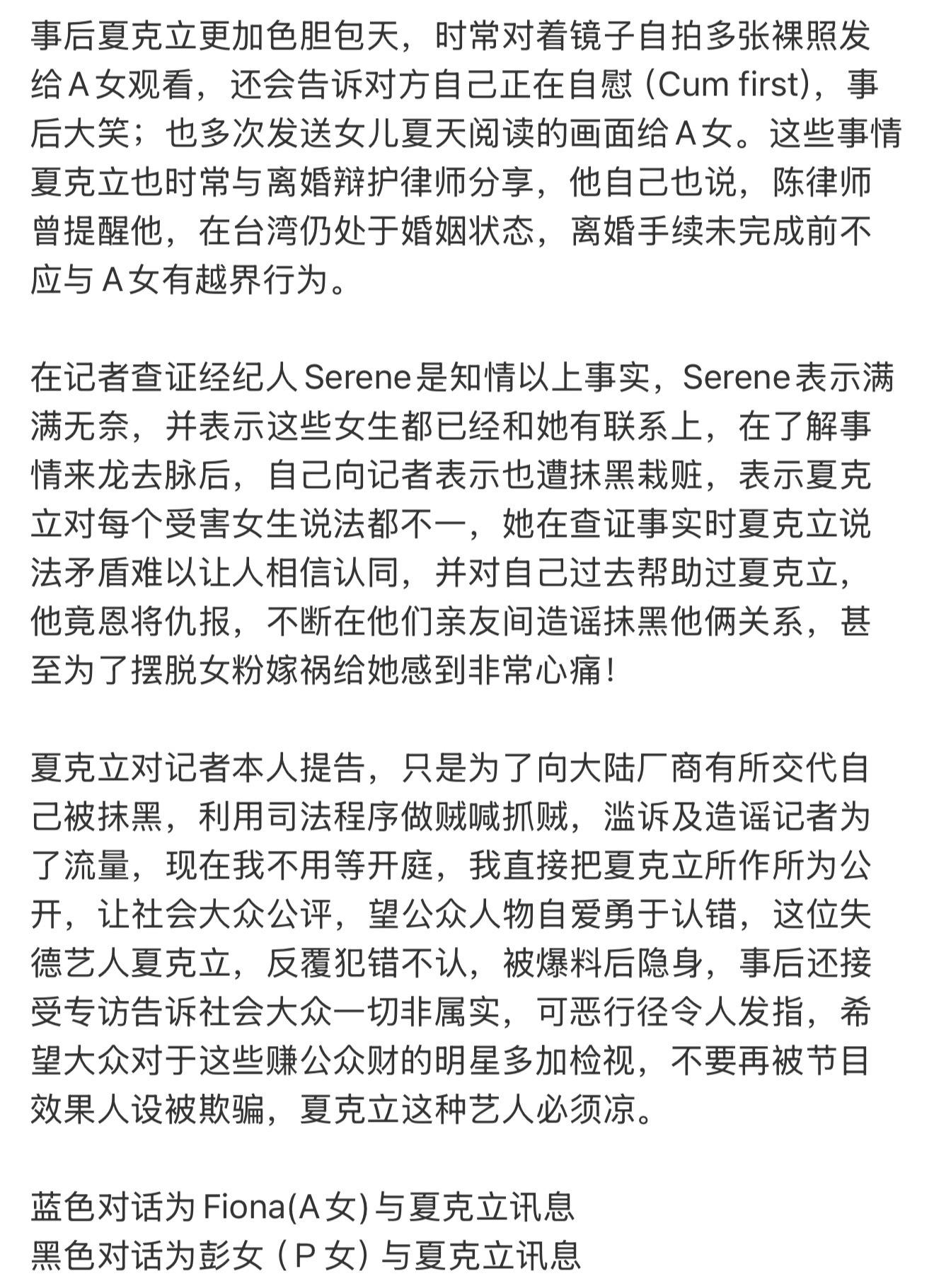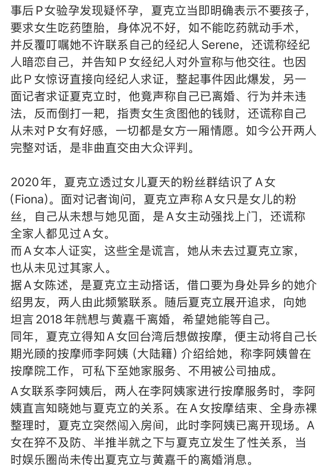 A女士:1️⃣夏克立在未与黄嘉千离婚时,就对在女儿夏天粉丝群结识的女方展开追求。2️⃣在女方按摩时闯入房间夏与之发生了性关系。3️⃣事后时常发自己的裸照以及女儿夏天阅读的画面给女方。