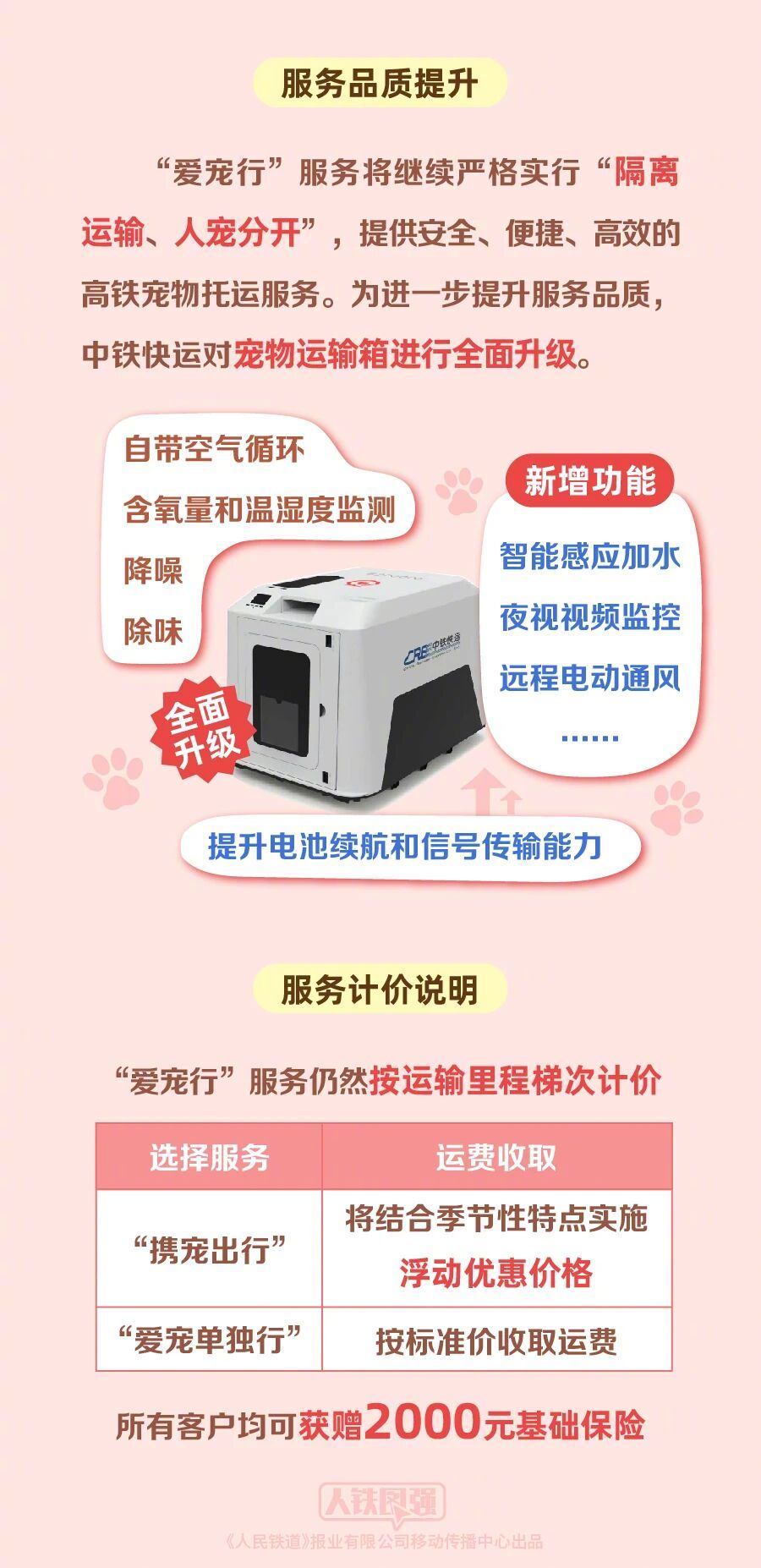 在深入总结试行经验的基础上,铁路部门进一步优化高铁宠物托运产品,丰富服务场景,提升运营品质,推出“爱宠行”服务,提供“携宠出行”与“爱宠单独行”两种托运模式,为旅客提供更多选择。
