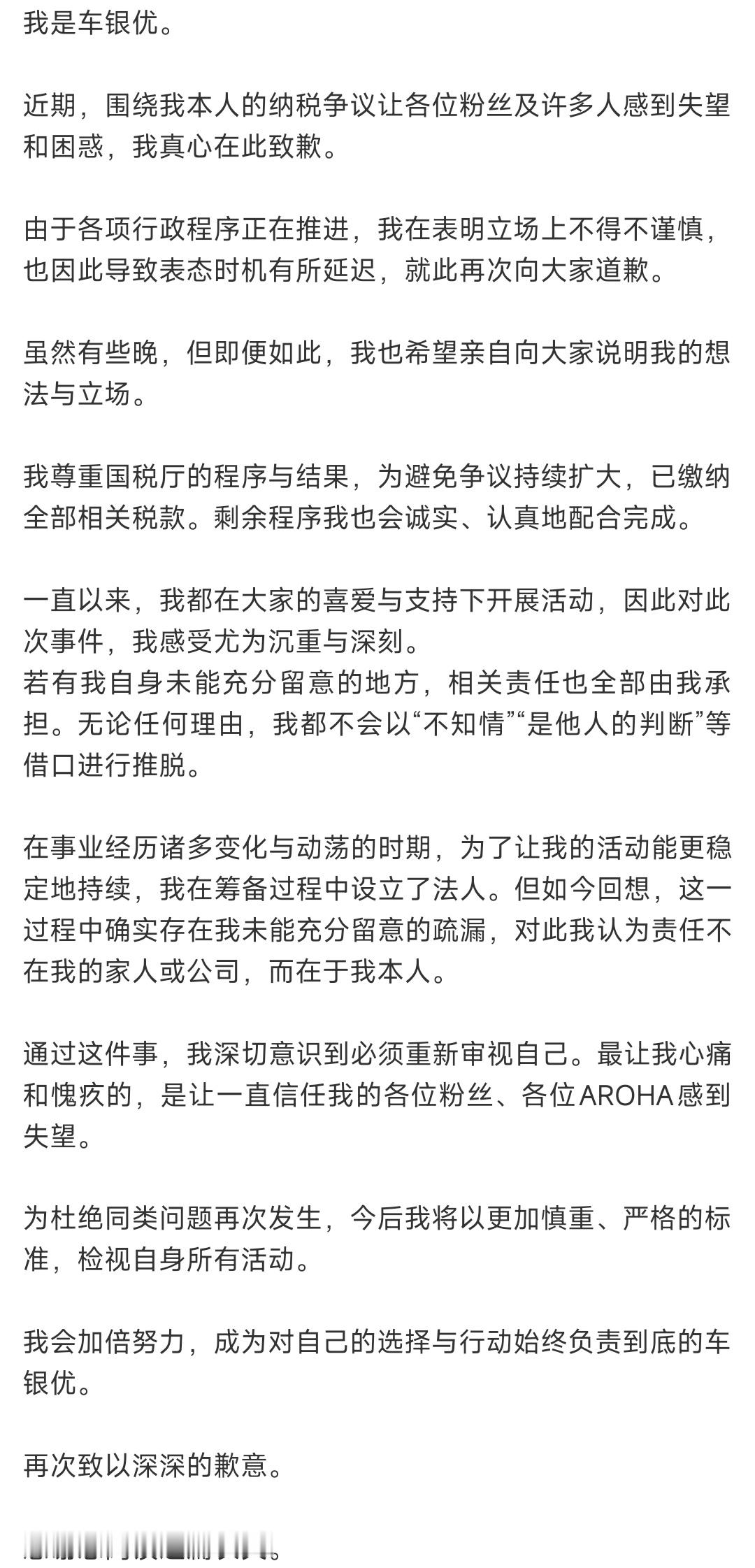 车银优发长文正式道歉车银优称已补缴税款
