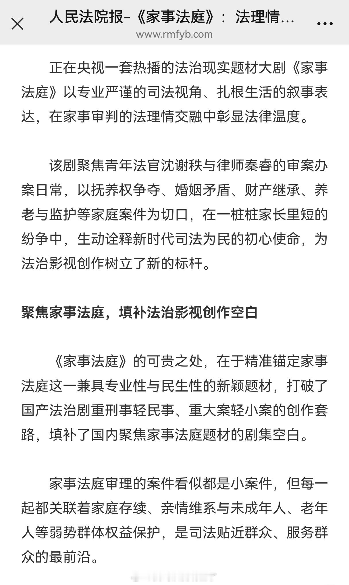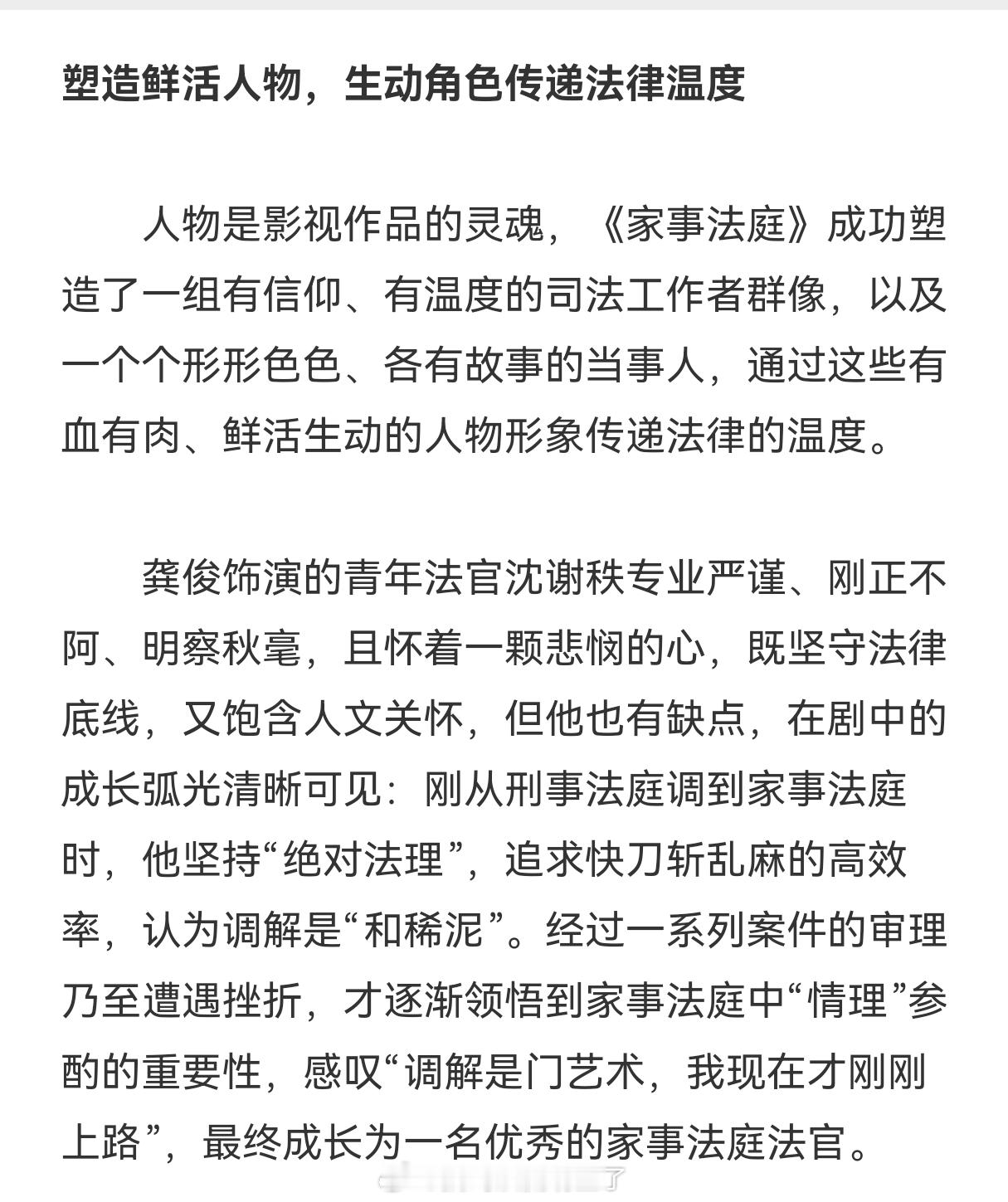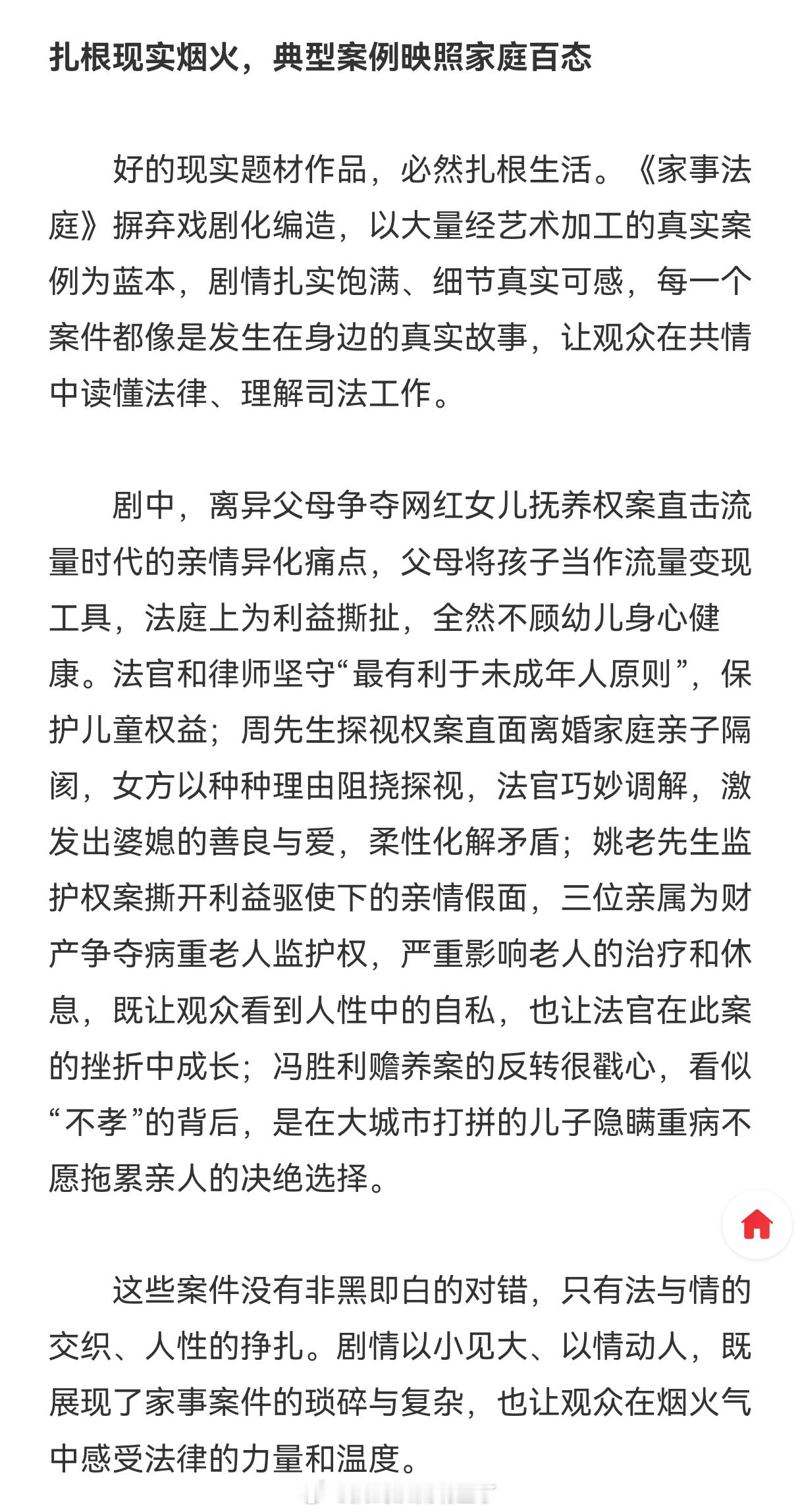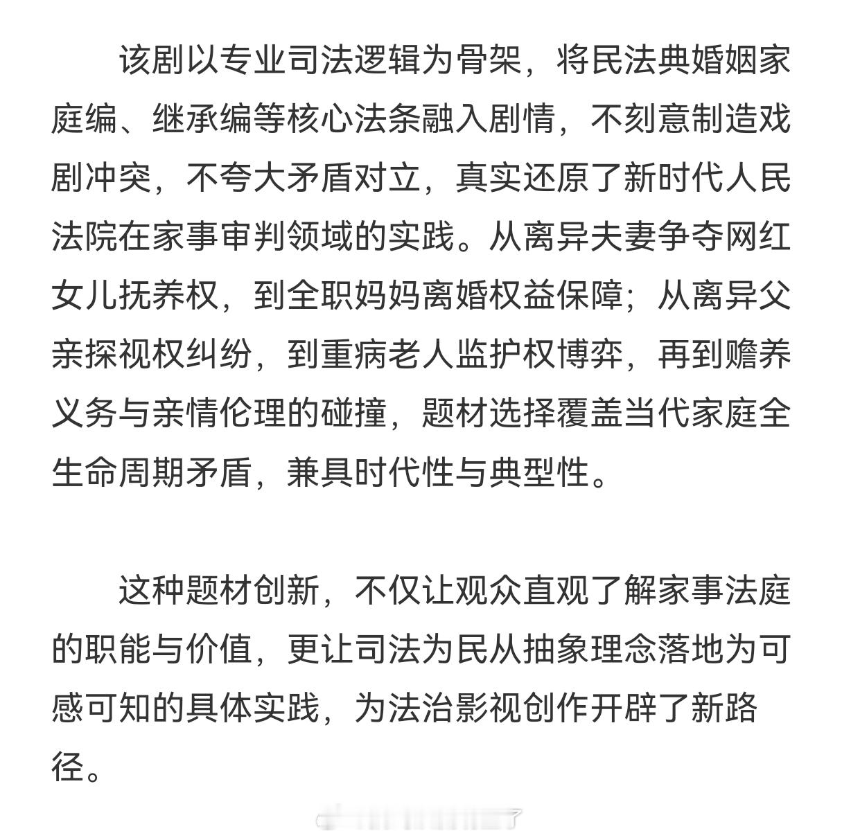 《家事法庭》以家事审判和调解小切口承载国家法治大主题,在法理情交融中彰显法律温度,践行司法为民,既展现了新时代家事法庭的工作风貌,也传递了法治守护万家灯火的温暖力量。家事法庭家事法庭大结局
