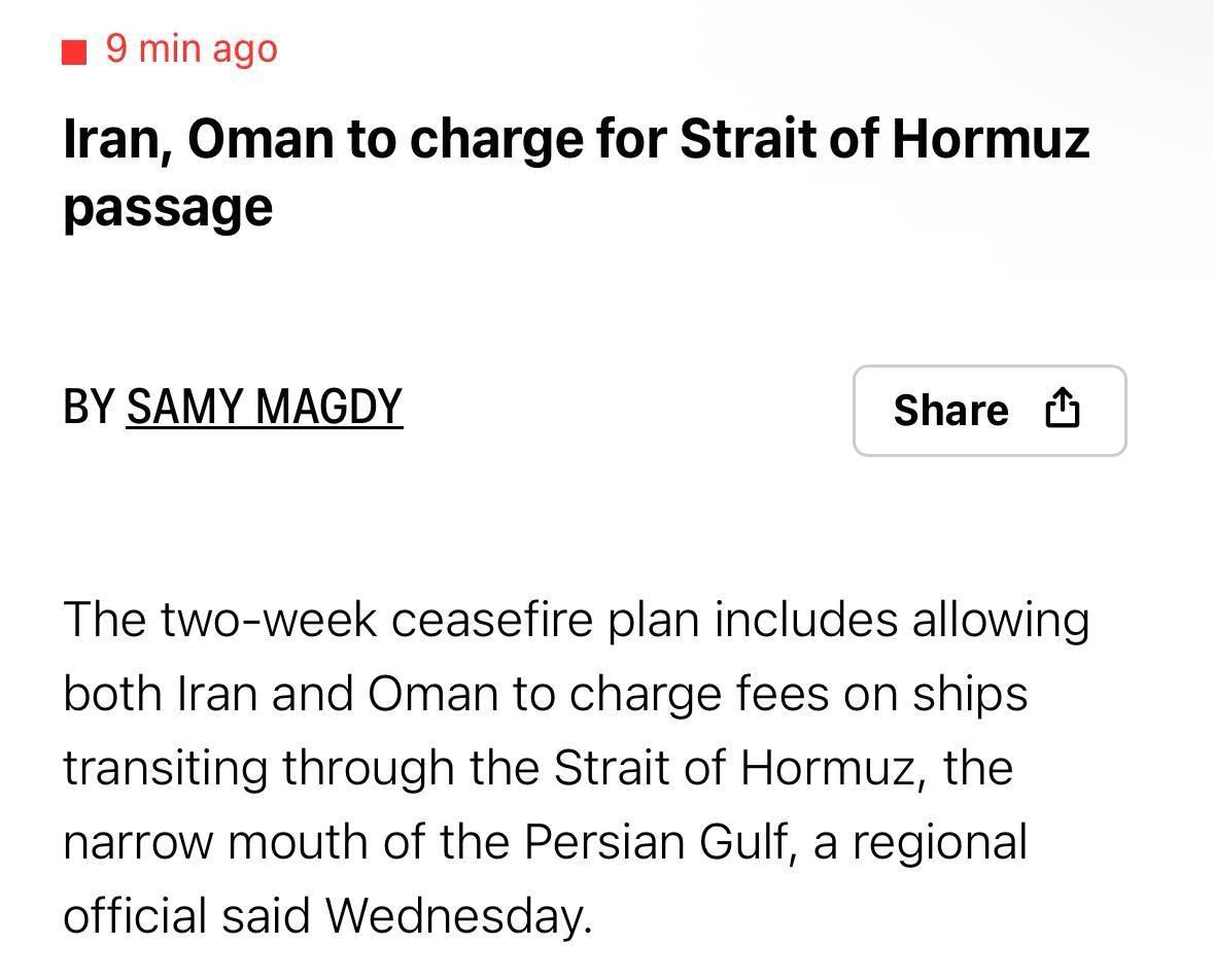 美联社报道,伊朗和阿曼将在为期两周的停火期间开始对所有途经霍尔木兹海峡的船只收取通行费。