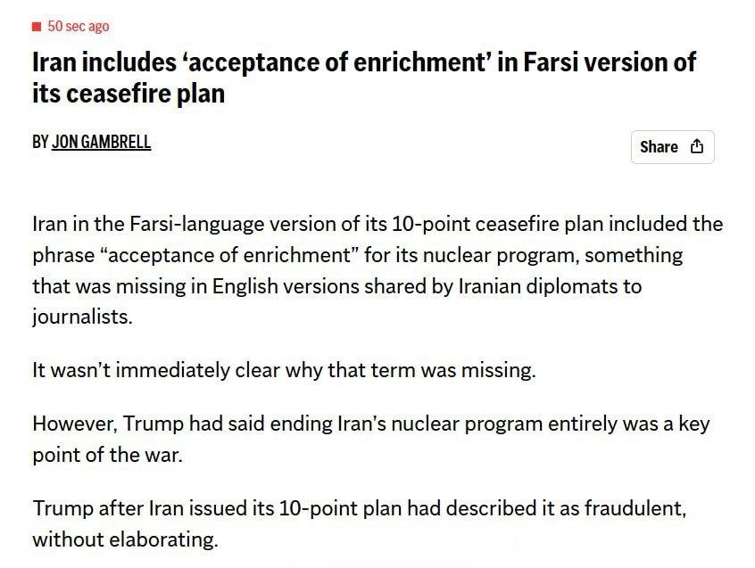 美联社报道,伊朗在其10点停火计划的波斯语版本中加入了包含“接受铀浓缩活动”的表述,而这一内容在伊朗外交官分发给记者的英文版本中并未出现。目前尚不清楚该术语缺失的具体原因。特朗普表示彻底终结伊朗的核计划是这场战争的关键目标。