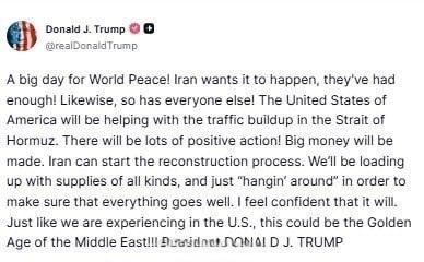特朗普最新发帖:“世界和平的伟大日子!伊朗希望和平到来,他们受够了!其他国家也一样!美利坚合众国将协助疏导霍尔木兹海峡的交通。将会有很多积极的行动!将会有大笔资金流入。伊朗可以开始重建进程。我们将装载各种物资,并“驻守”以确保一切顺利。我相信它会成功。就像我们在美国正在经历的那样,这可能是中东的黄金时代!!!”