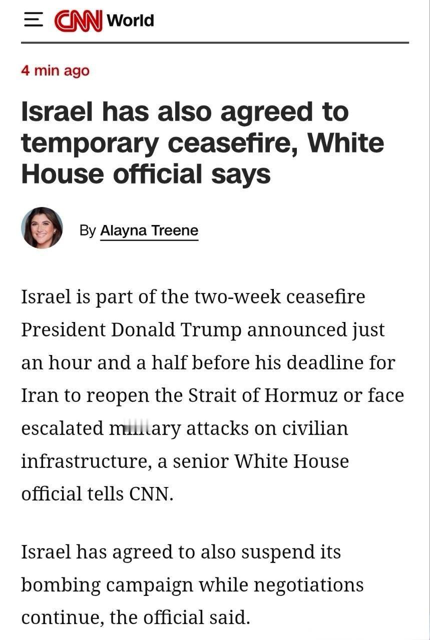 CNN援引白宫官员消息报道:以色列也已经同意了2周停火的协议。