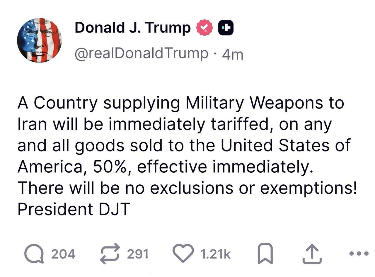 特朗普最新发帖称,任何对伊朗出售武器的国家将被立即加征关税50%。 ​​​