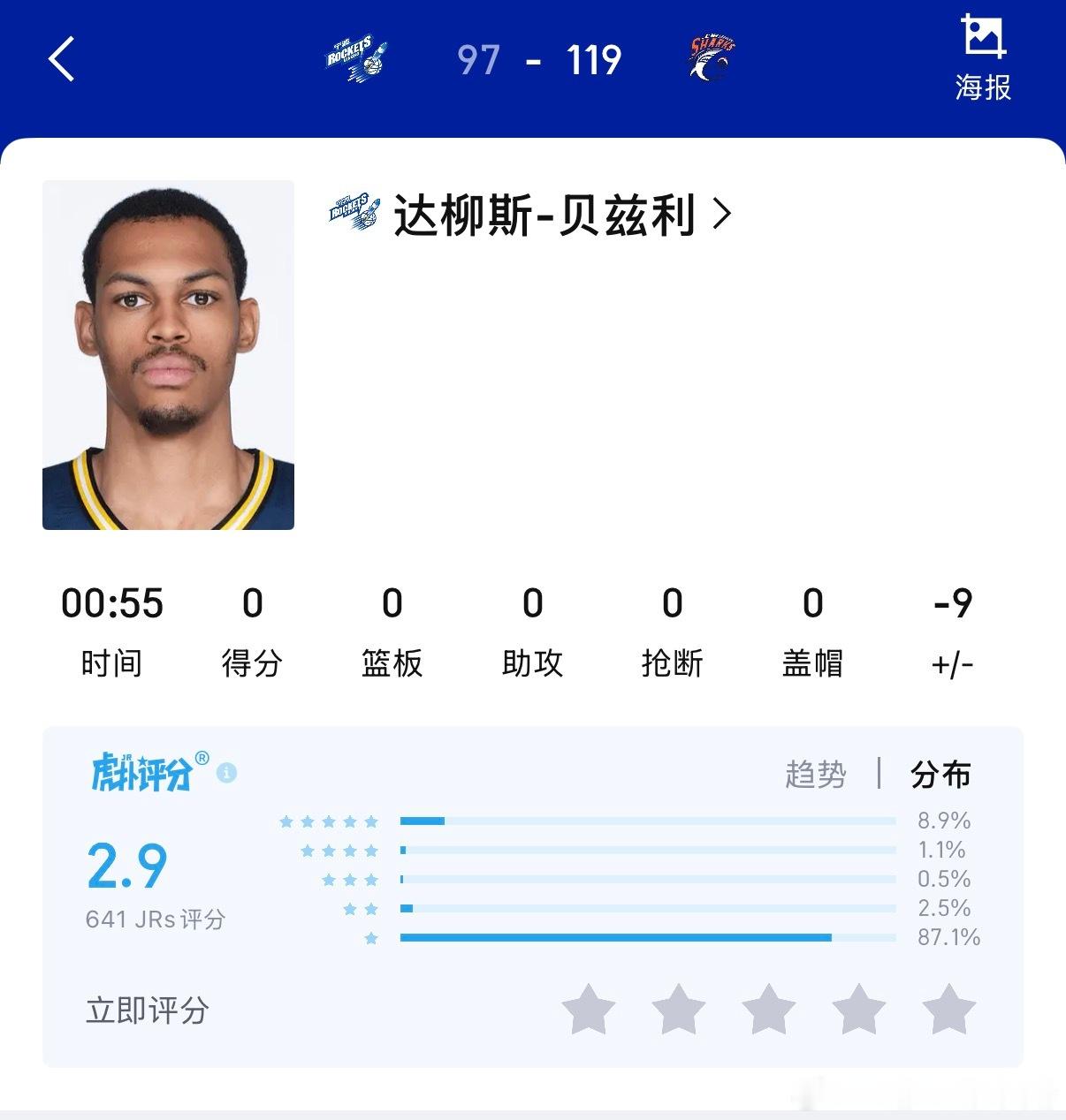 宁波男篮 前广东男篮外援贝兹利今天在宁波对阵上海的比赛中出现55秒,正负值-9。
