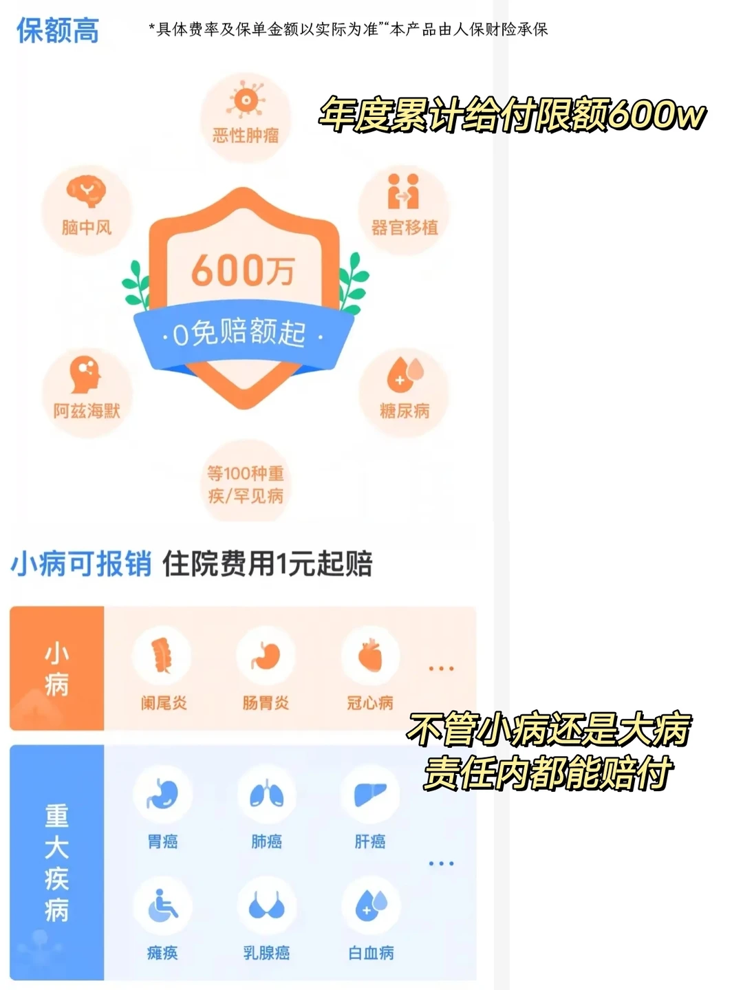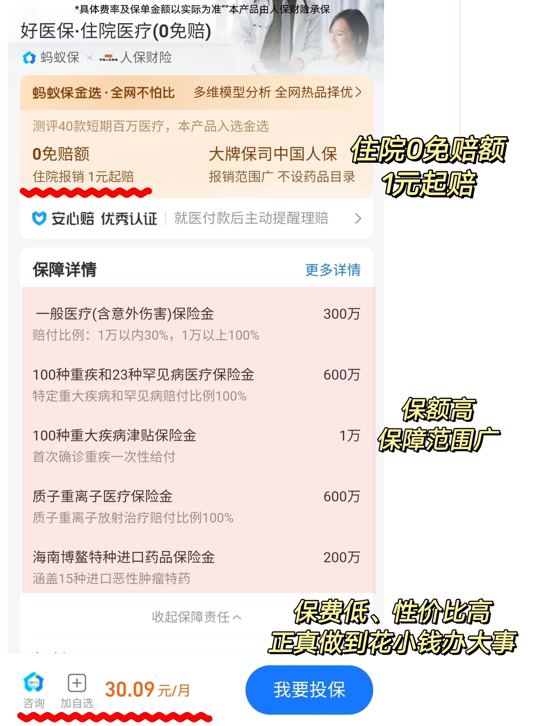 首先,它是人保财险这个大公司承保的,品牌值得信赖。而且,它是0免赔额,住院1元起就能赔,不设免赔额。一般医疗年累计自费1万以内,报销比例为30%,1万以上赔付比例100%。