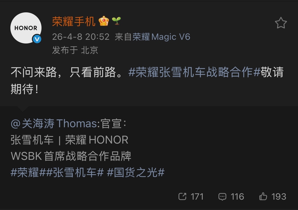 张雪机车刚在WSBK拿了历史性的双冠,加上他从学徒一路拼上来的经历,跟荣耀死磕技术的感觉确实挺搭。两边用户重合度也高,后续要是真出个联名手机或者搞点车机互联,还挺有想象空间。荣耀与张雪机车官宣合作荣耀张雪机车战略合作