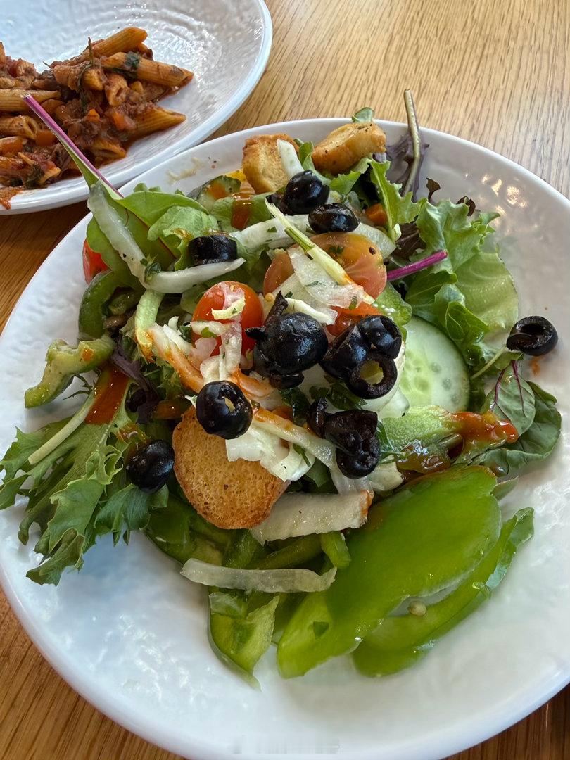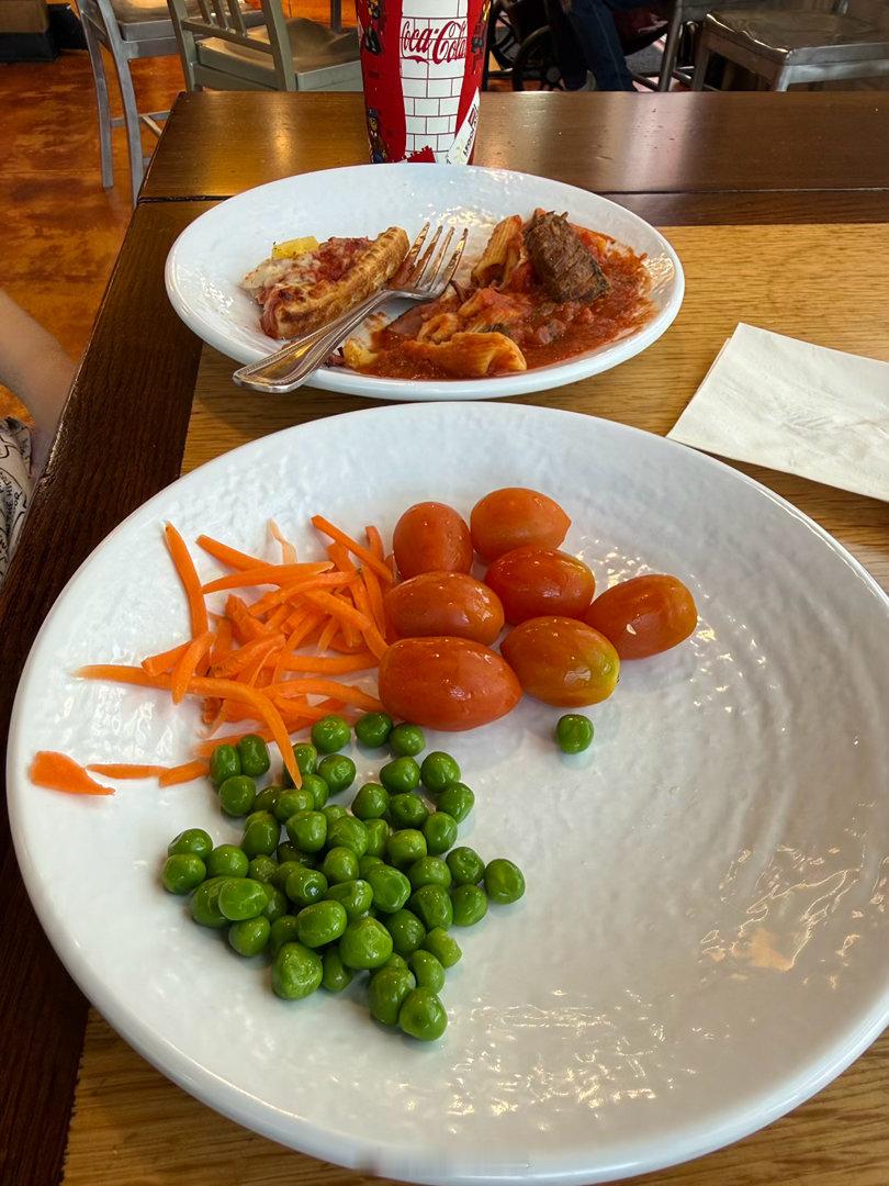 自助沙拉,怒嚼两盘。以身作则带动女儿吃了图三的一点蔬菜。