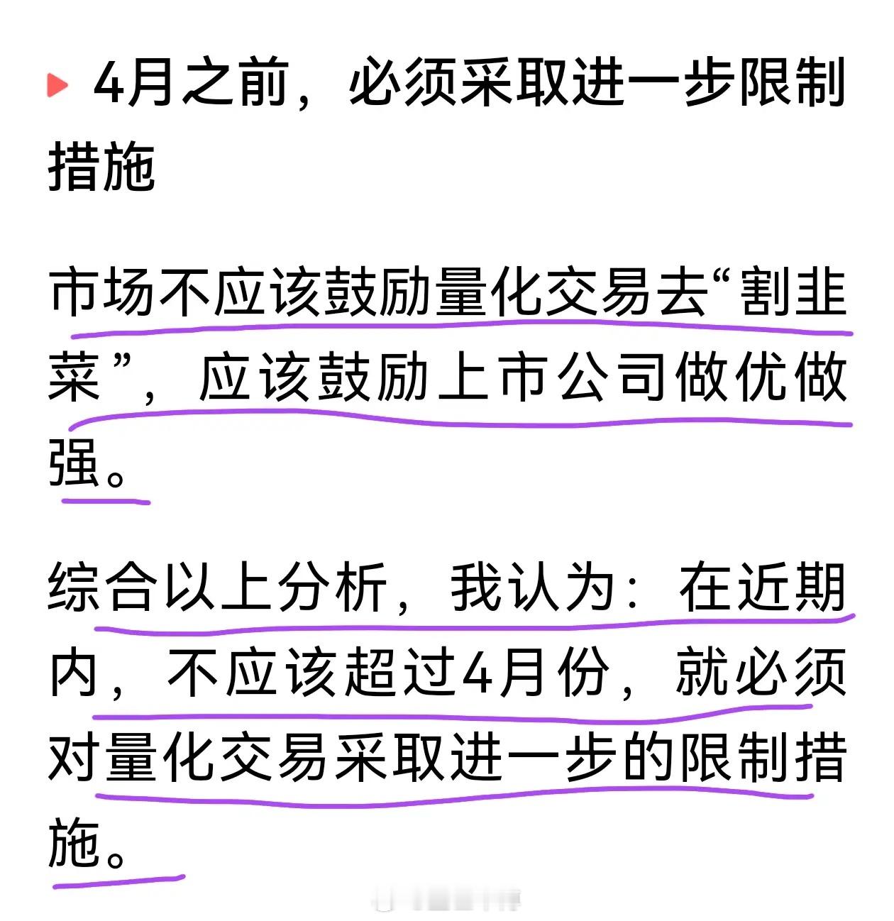 刘纪鹏教授够执着的:量化赚的是存量财富分配的钱,4月之前必须采取进一步限制措施。刘教授认为A股市场量化交易占比35%,赚的就是别人亏损的钱,股市搞成零和博弈,股市涨不起来。其同质化操作引发市场暴跌,还可以跨市场套利,应该进一步加限制,鼓励投资者赚公司价值成长的钱。量化交易一直为市场所诟病,其在提供流动性的同时,负面影响不用忽视,专家学者有深入的分析,散户也呼吁让市场更加公平,期待更严新规出台。一度传出量化新规4月7日,目前证明这是虚假信息,但其一定程度上反映了投资者的期待。刘教授建议4月之前采取进一步措施,对股市重新站上4000点,开始真正的慢牛行情是有好处的。不过从刘教授历次建议来看,被采纳的几乎没有,但他就是反复地讲,也算是良心专家了。