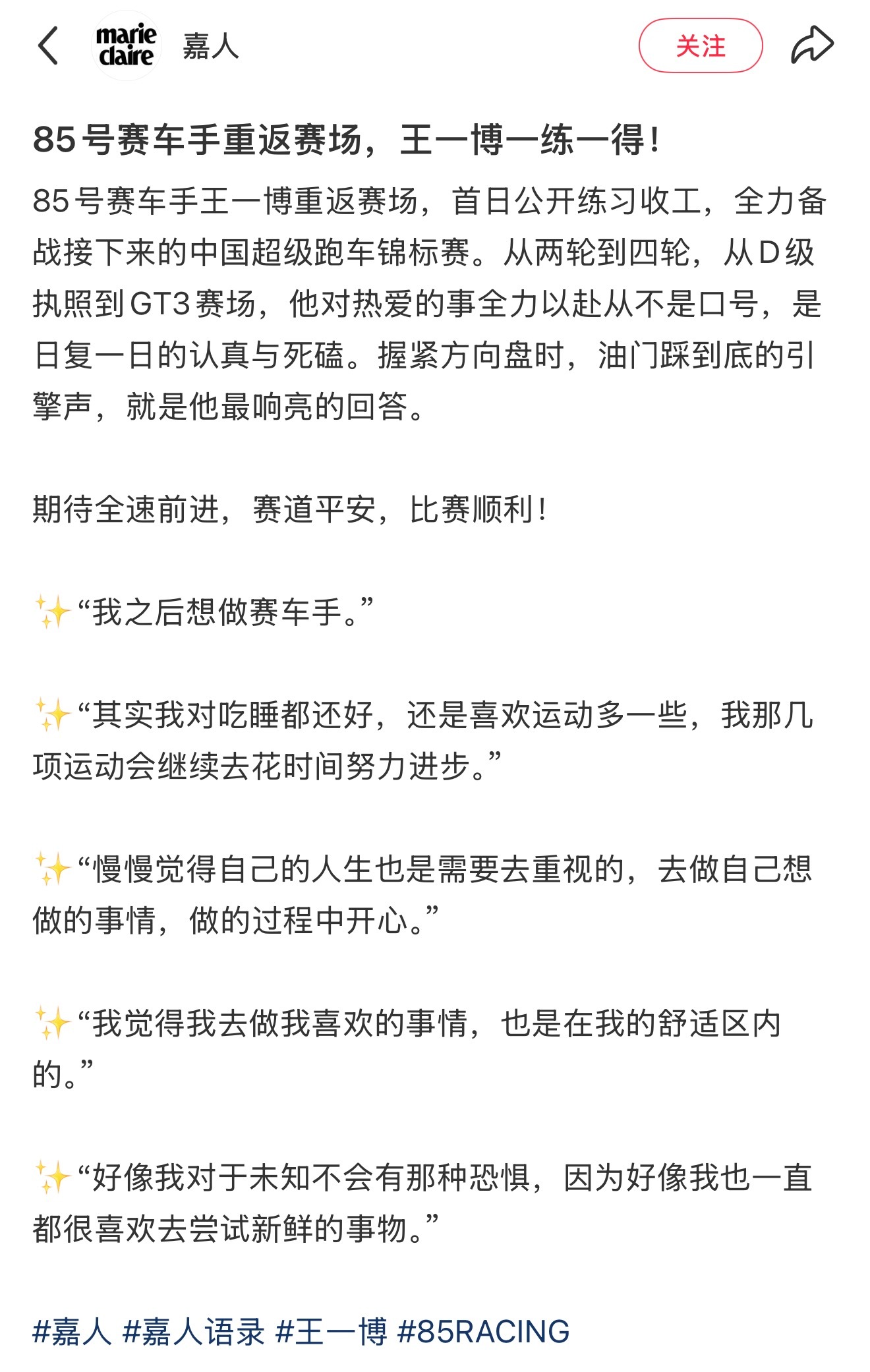 嘉人总结85号赛车手语录:“我之后想做赛车手。”“其实我对吃睡都还好,还是喜欢运动多一些,我那几项运动会继续去花时间努力进步。”“慢慢觉得自己的人生也是需要去重视的,去做自己想做的事情,做的过程中开心。”“我觉得我去做我喜欢的事情,也是在我的舒适区内的。”“好像我对于未知不会有那种恐惧,因为好像我也一直都很喜欢去尝试新鲜的事物。”