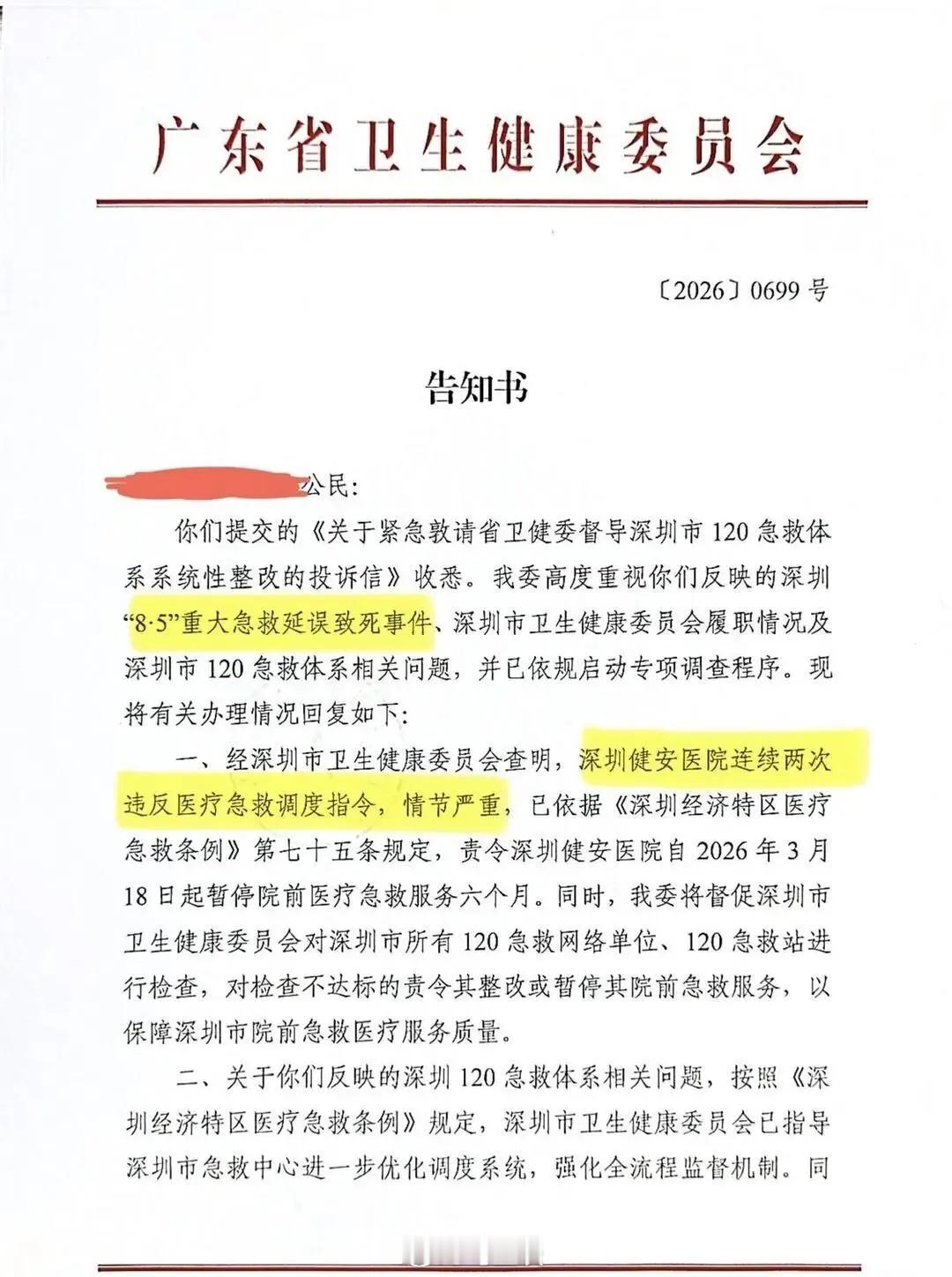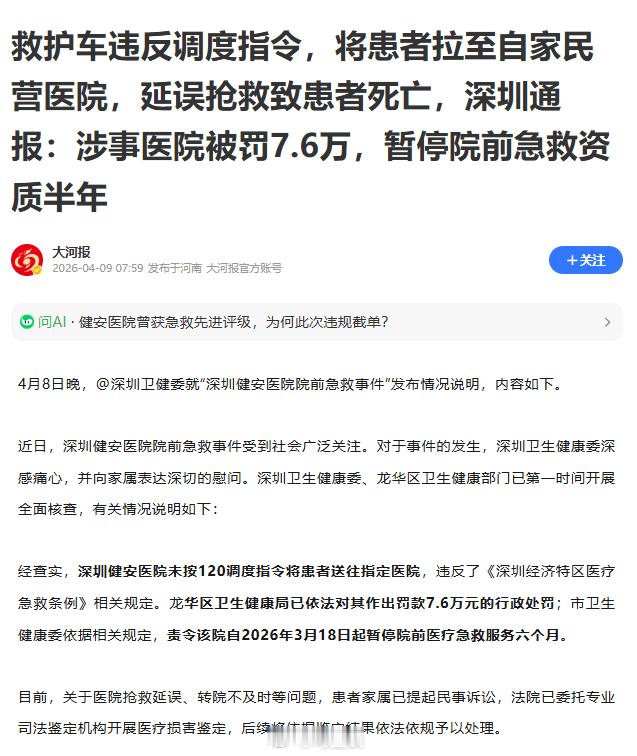 救护车违反调度指令,将患者拉至自家民营医院,无手术能力延误抢救8小时,致患者死亡!深圳通报:涉事医院被罚7.6万,暂停院前急救资质半年。这不是谋财害命,什么是谋财害命!1条人命罚款7.6万,无人担责,罚款还是罚医院的钱,看了案例的恶劣程度,这的确太轻微了,应该对相关负责人追究刑责!