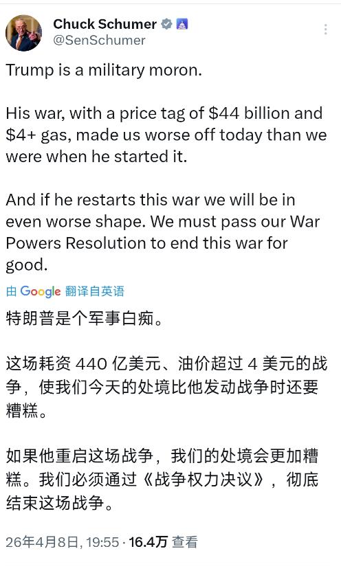 美国参议院民主党领袖查克·舒默今晚(北京时间4月8日)猛烈抨击道:“特朗普是个军事白痴。这场耗资440亿美元,油价超过4美元的战争,使我们今天的处境比他发动战争时还要糟糕。如果他重启这场战争,我们的处境会更加糟糕。我们必须通过《战争权力决议》,彻底结束这场战争。”