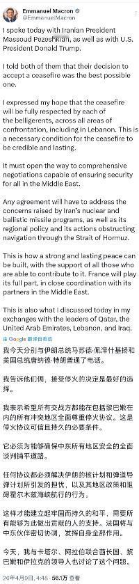 法国总统马克龙今天(北京时间4月9日)写道;“我今天分别与伊朗总统马苏德·佩泽什基扬和美国总统唐纳德。特朗普通了电话。我告诉他们俩,接受停火的决定是最好的选择。